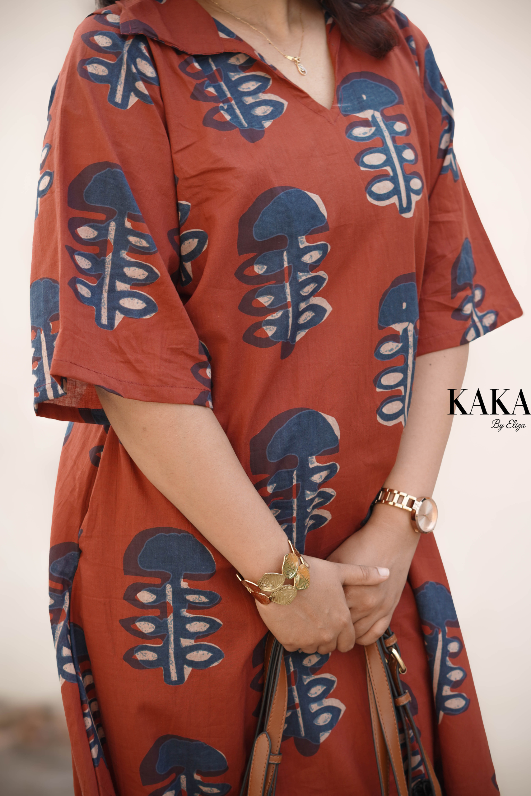 Effortlessly graceful, the Aranya Midi Dress brings together earthy tones and nature-inspired prints. Crafted from soft, breathable cotton, this dress features a relaxed silhouette that drapes beautifully on all body types. The rich rust base with contrasting motifs makes it a versatile pick for everyday elegance and slow fashion lovers.