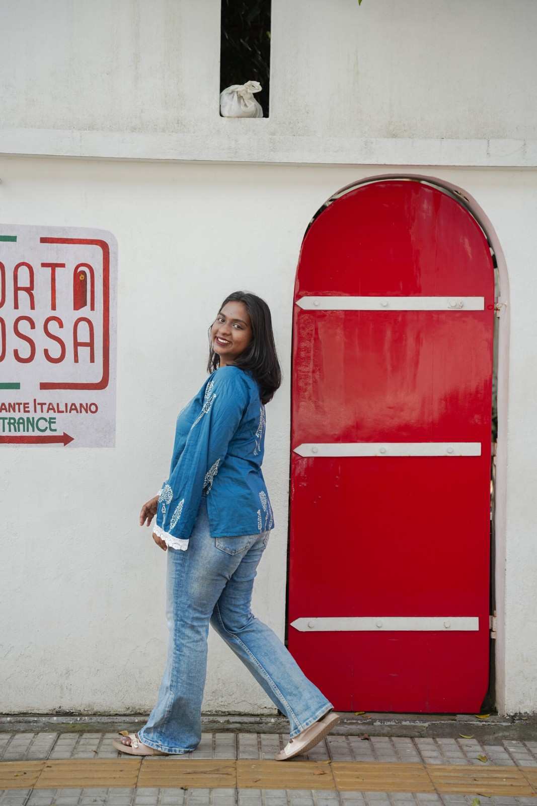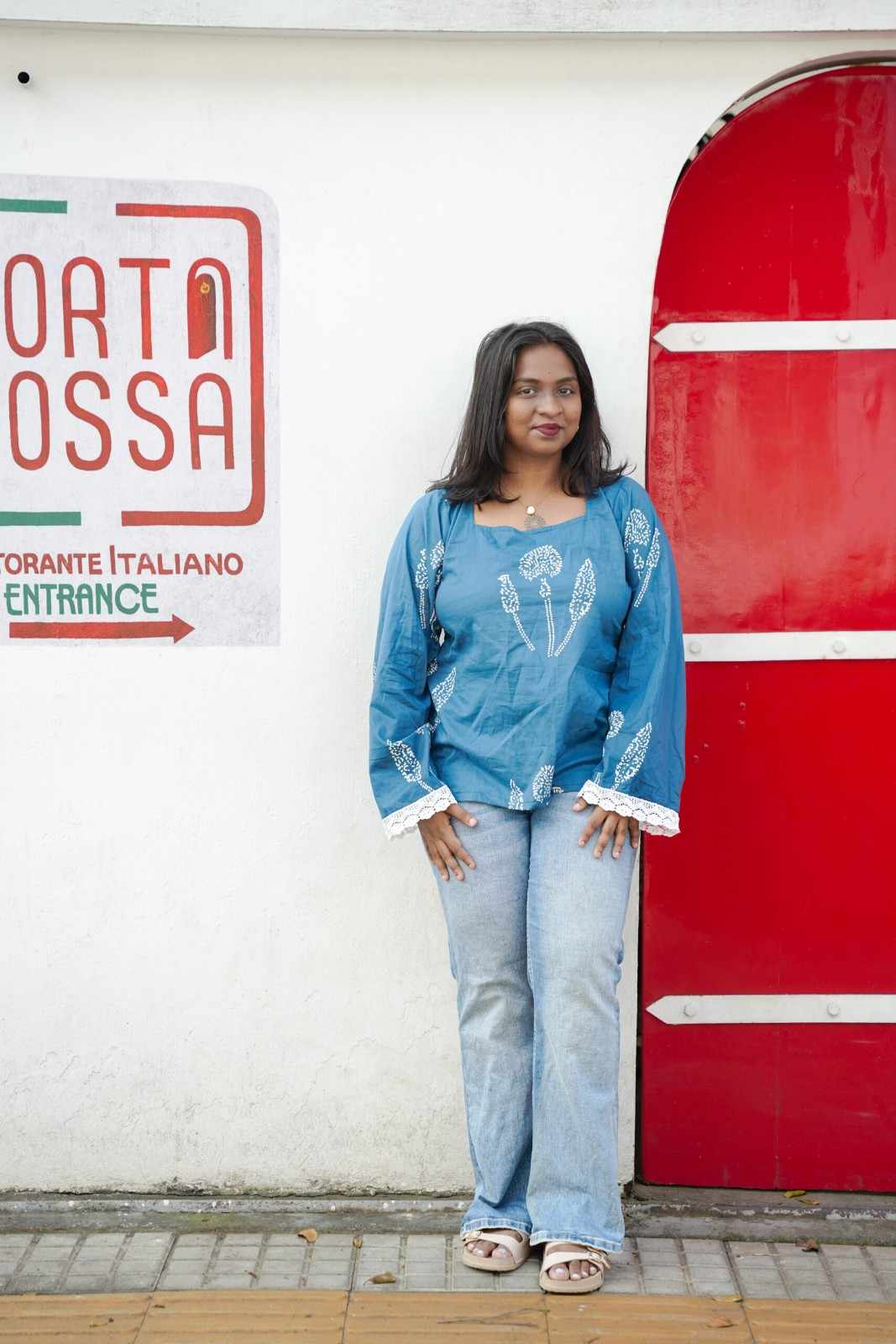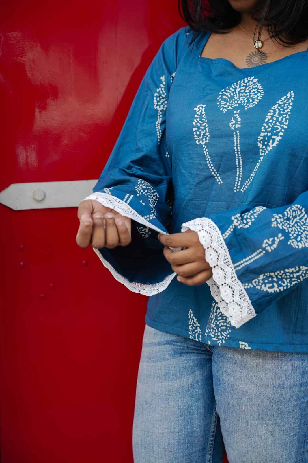 Designed for everyday elegance, the Blue Bell Cotton Top is crafted from breathable cotton fabric that feels light and gentle on the skin. Featuring delicate all-over motifs and contrast lace detailing on the sleeves, this top blends comfort with subtle sophistication.