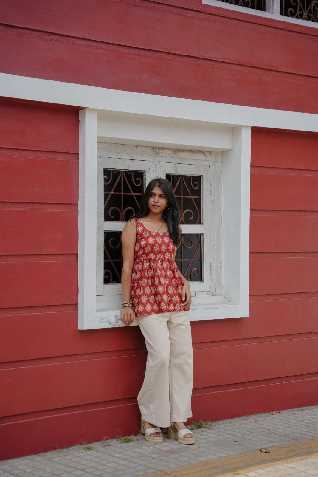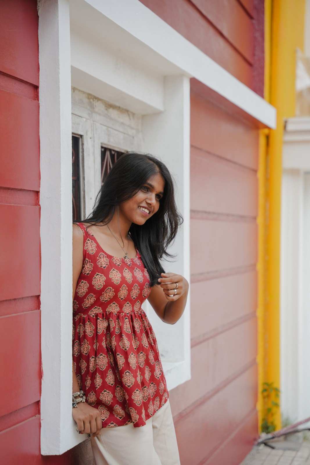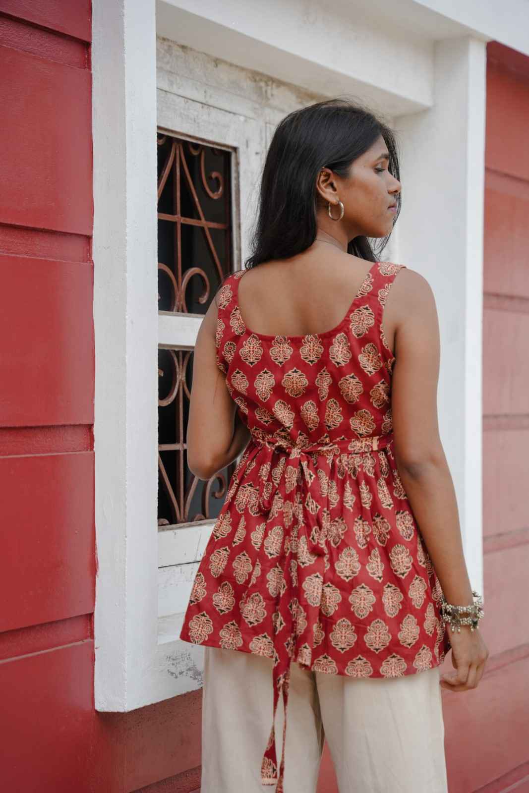 Charming and effortlessly feminine, this sleeveless printed top features a softly flared peplum silhouette that adds graceful movement and comfort. Designed with a delicate all-over floral motif and a relaxed fit, it flatters the body while remaining easy to wear. Perfect for warm days, this top blends traditional-inspired prints with modern styling.