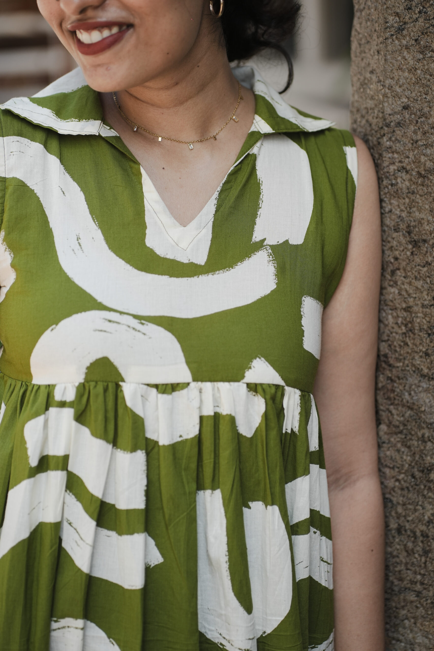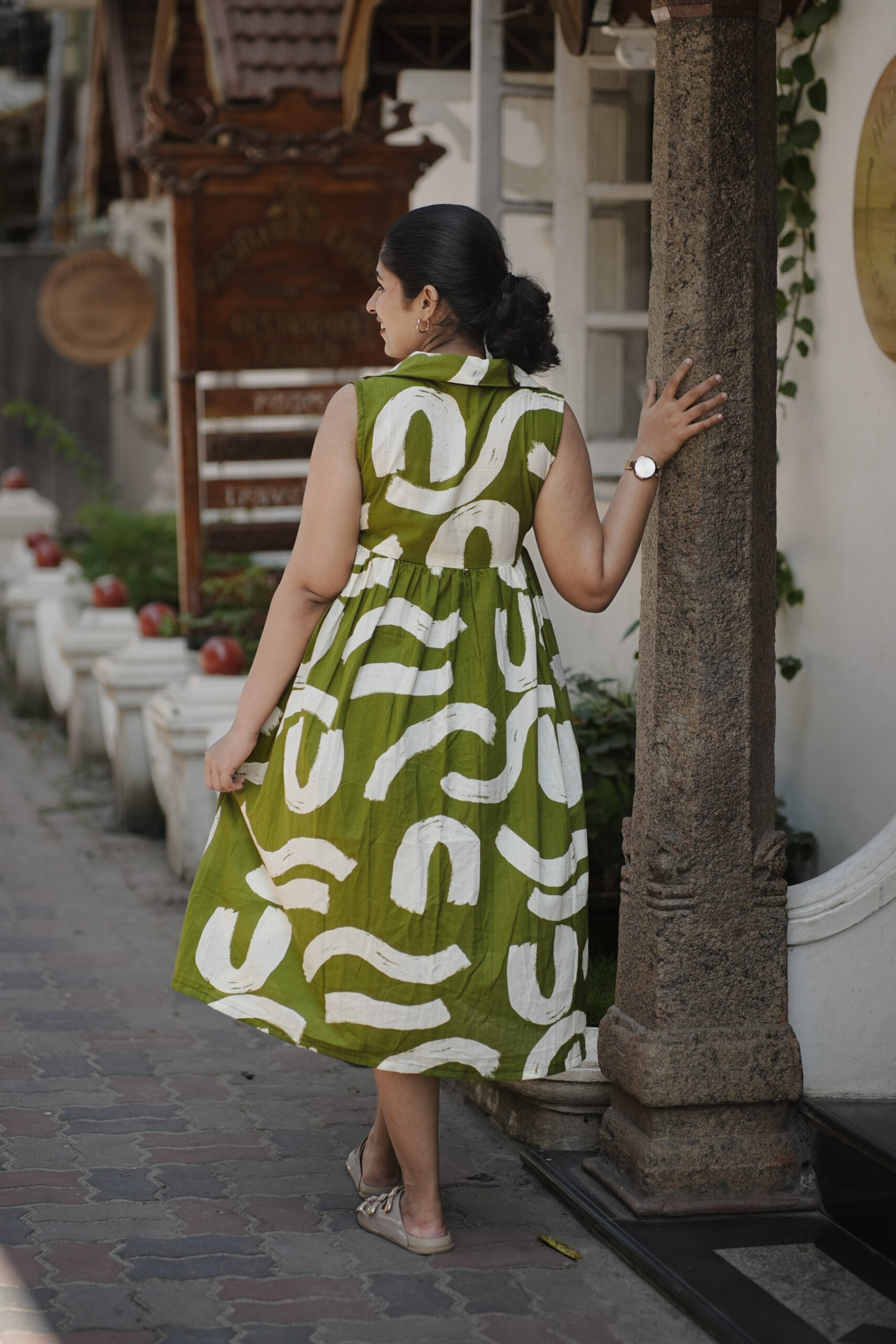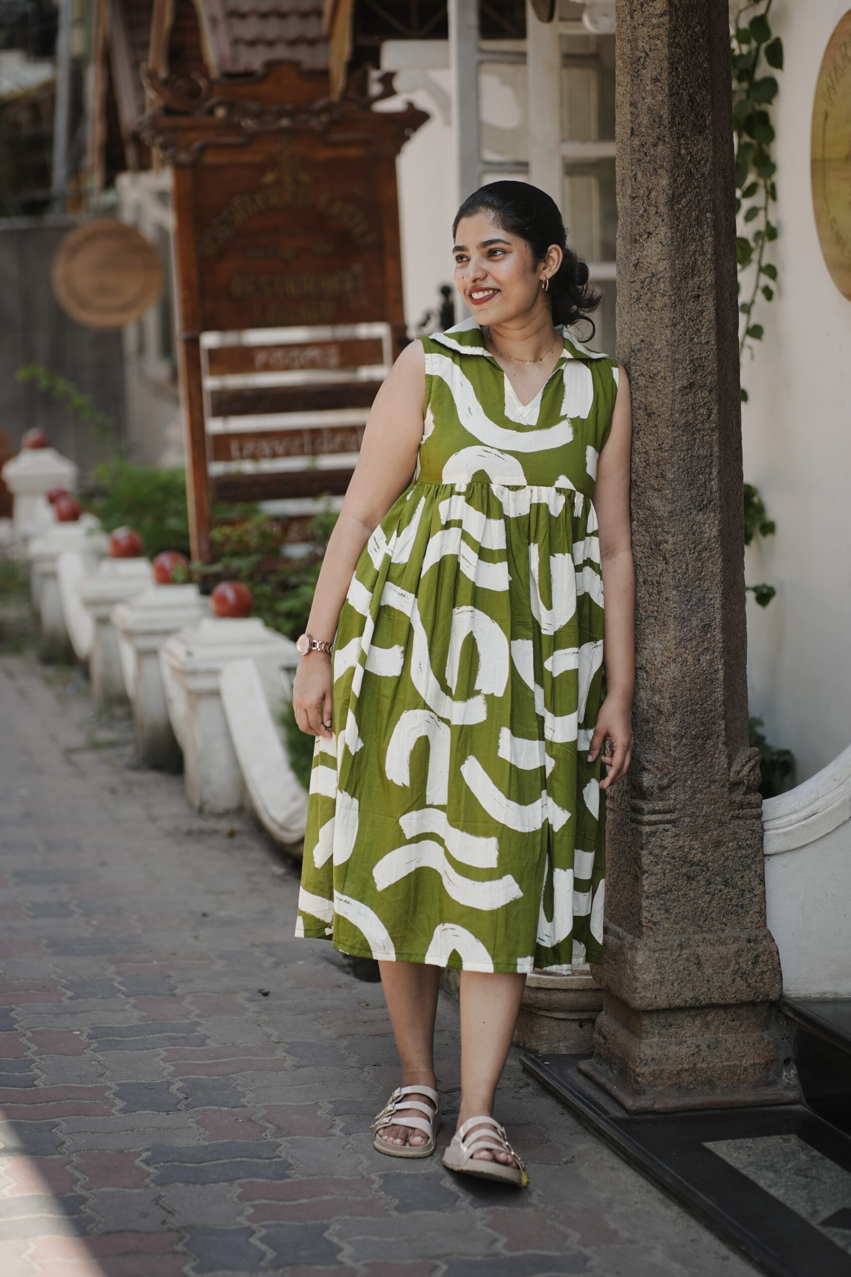 Step into easy elegance with our Curvoli Dress, designed in a refreshing olive green canvas adorned with hand-painted style white strokes. This sleeveless midi dress is crafted to give you all-day comfort, breezy movement, and a sophisticated contemporary look. The gently gathered waistline adds a flattering shape while keeping the silhouette relaxed and fuss-free.