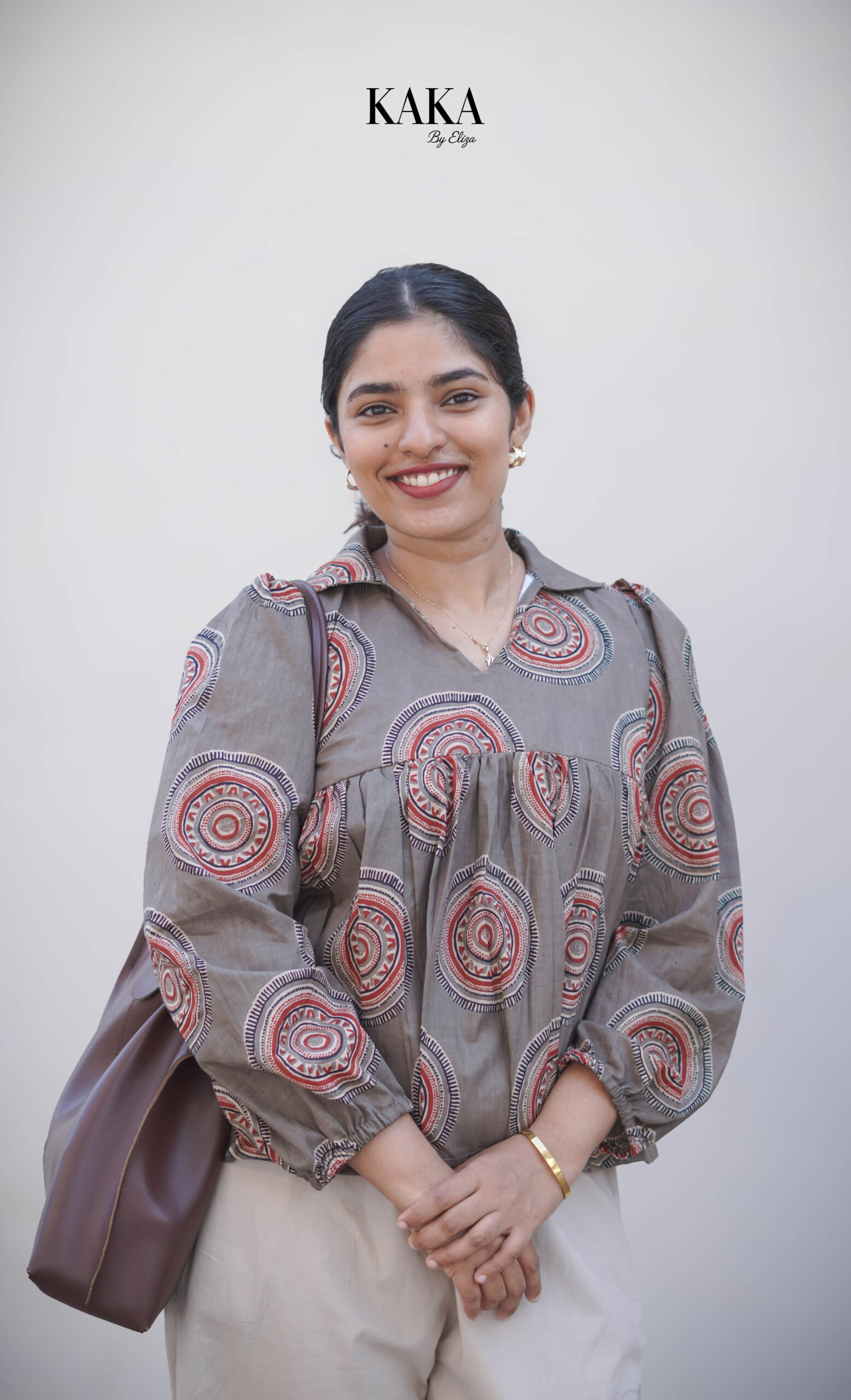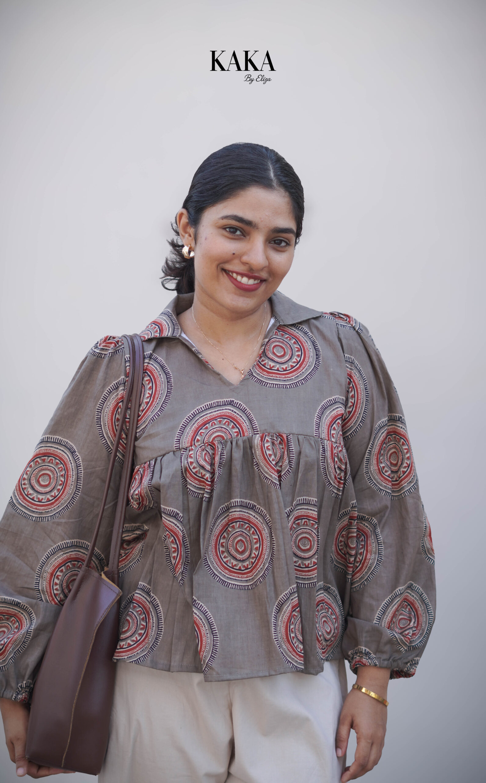 The Earth Print Top from Kaka by Eliza blends comfort with subtle elegance. Designed in warm, earthy tones with a classic circular print, this top brings a calm and refined look to your everyday style.