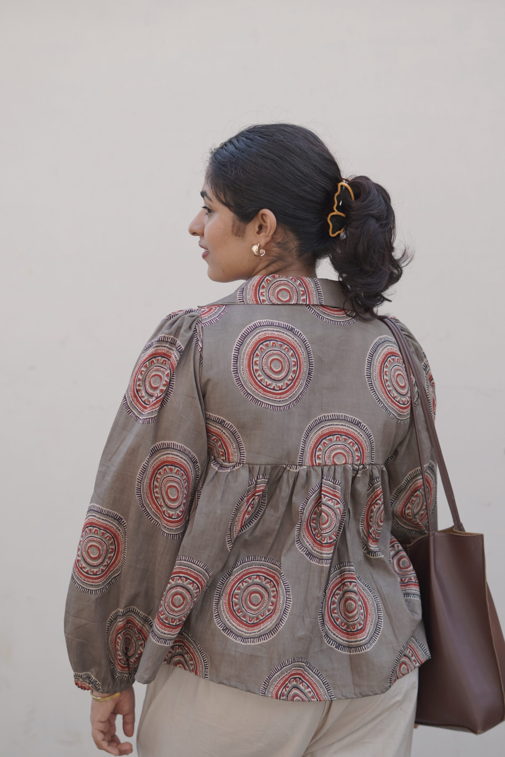 Featuring a relaxed fit with soft gathers and full sleeves, it offers both comfort and a graceful silhouette. The collared neckline adds a touch of structure, making it suitable for both casual and semi-formal wear.