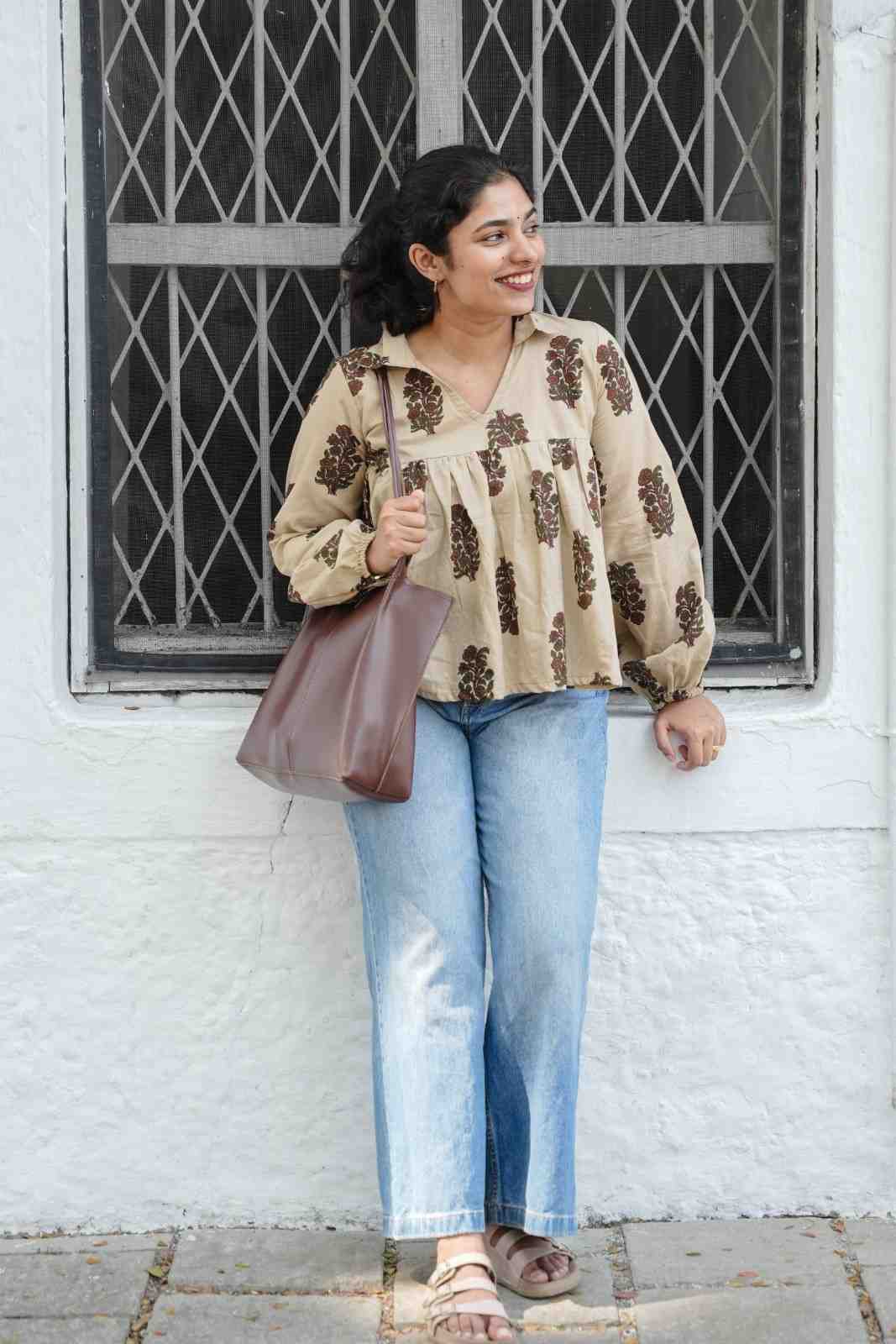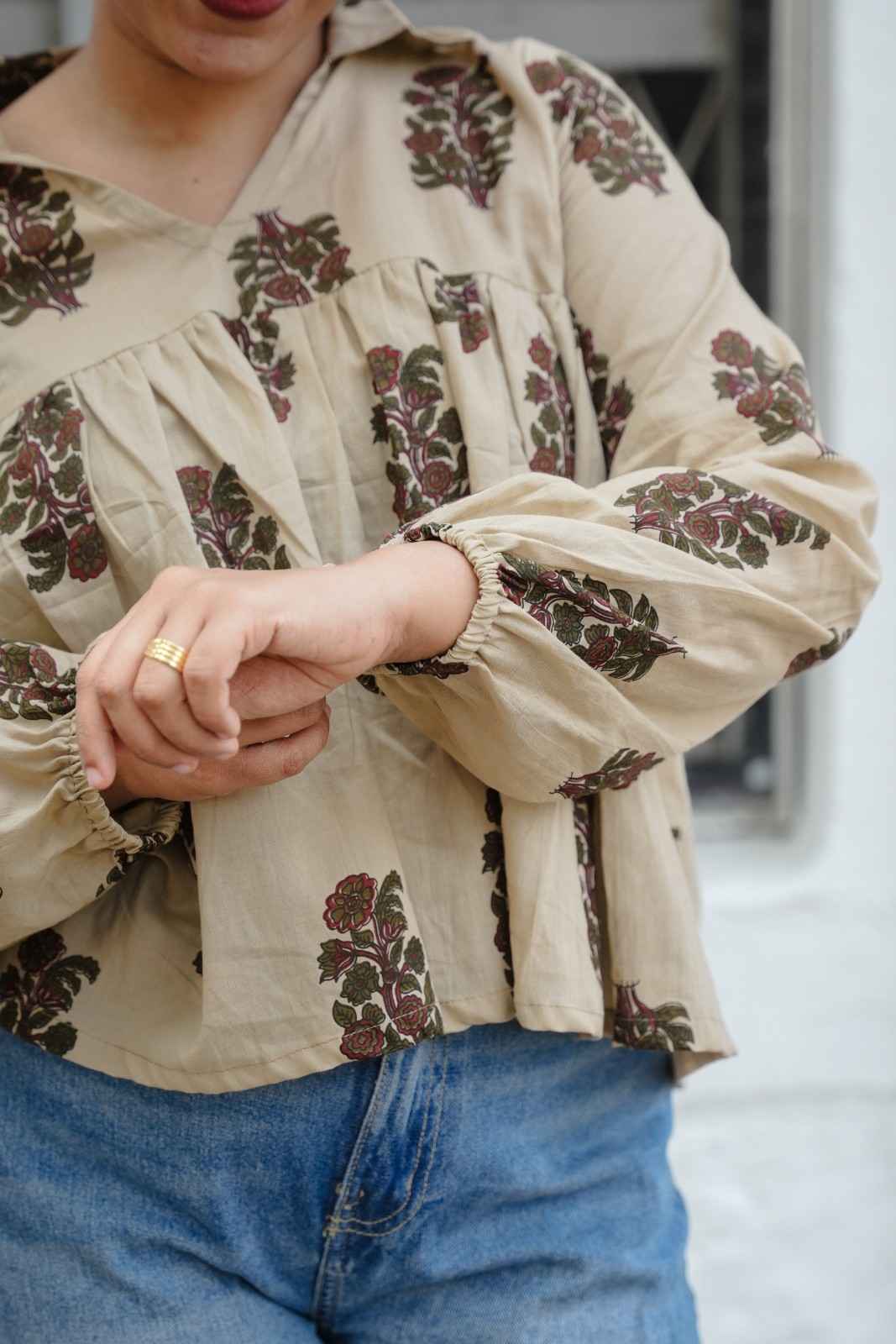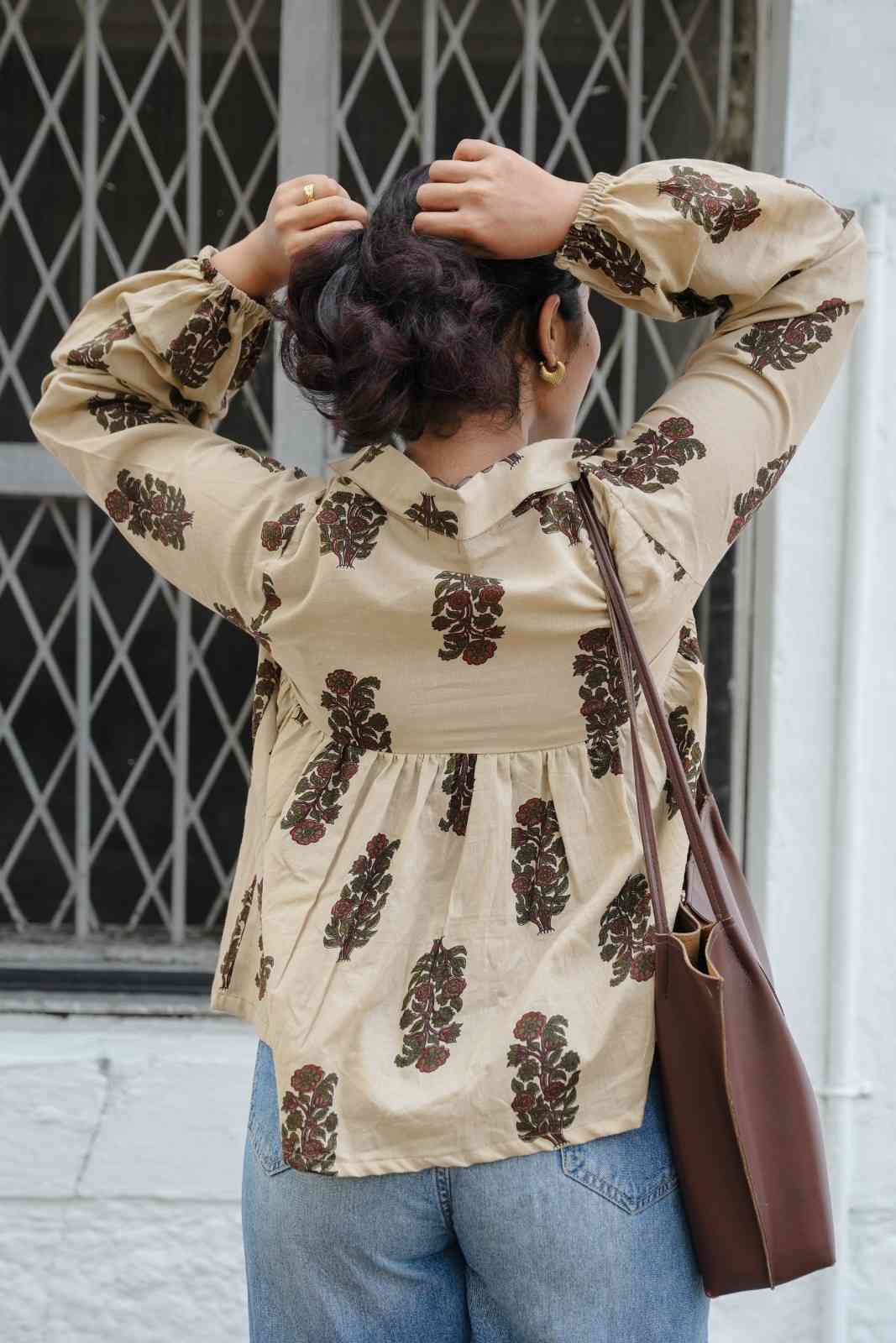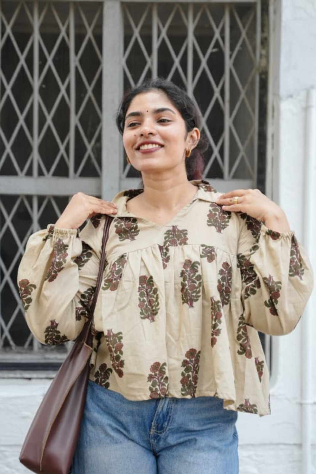 Designed for effortless everyday elegance, this ivory-toned printed top features a relaxed peplum silhouette with soft gathers and full-length sleeves. The subtle earthy floral motifs add a natural charm, while the breathable fabric keeps you comfortable all day. A perfect blend of grace and ease for casual outings and relaxed styling.