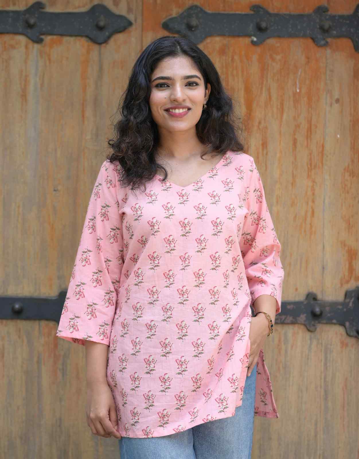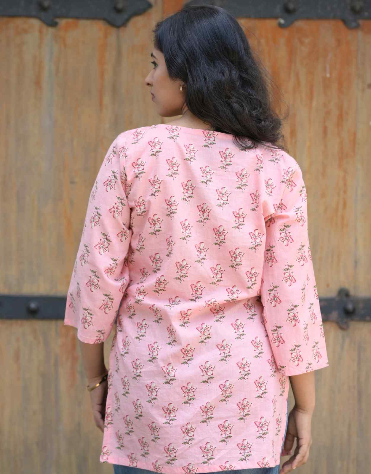 Grace meets comfort in this Elegant Rose Kurti. Designed in a soft pastel pink cotton with delicate rose hand block prints, it features a flattering V-neckline and breezy 3/4th bell sleeves. Perfect for laid-back brunches or casual office days, it pairs beautifully with jeans or palazzos for a clean, fresh look.