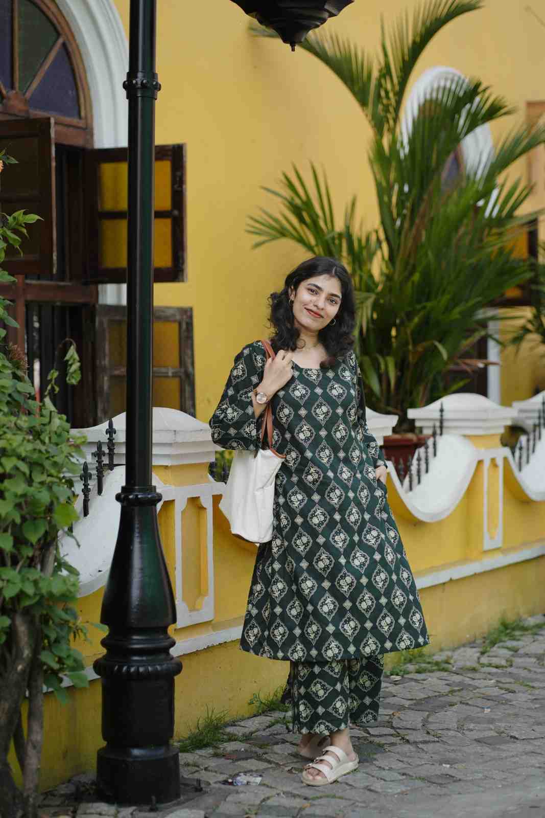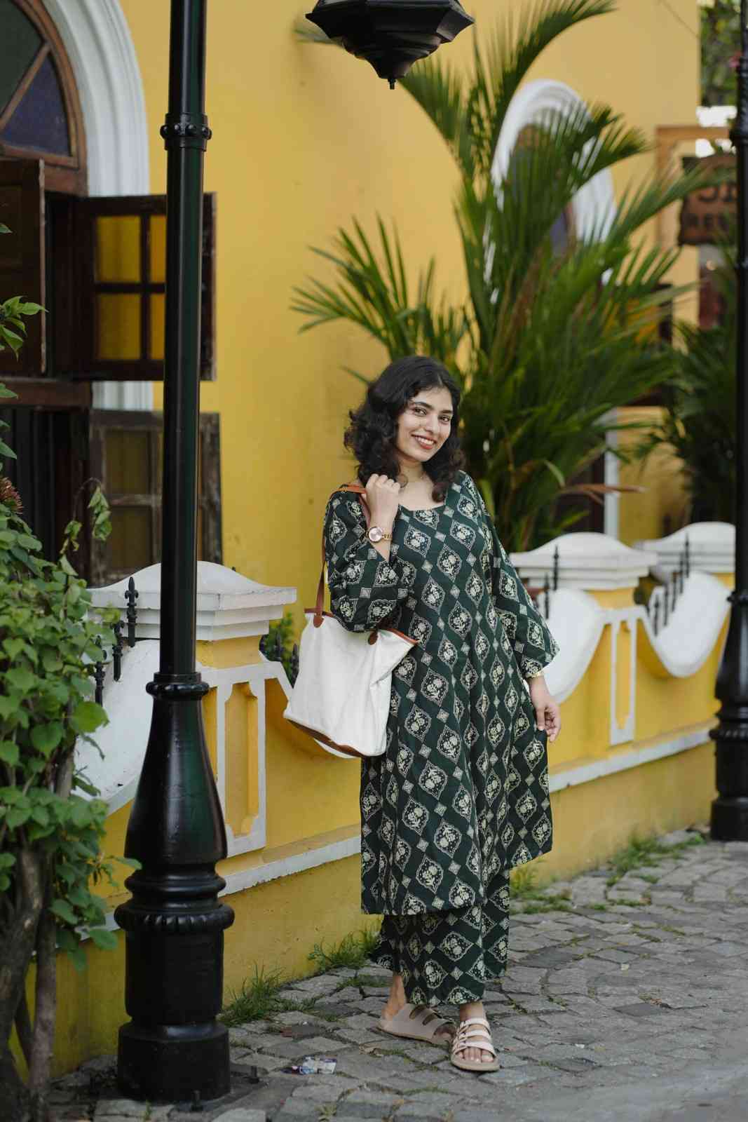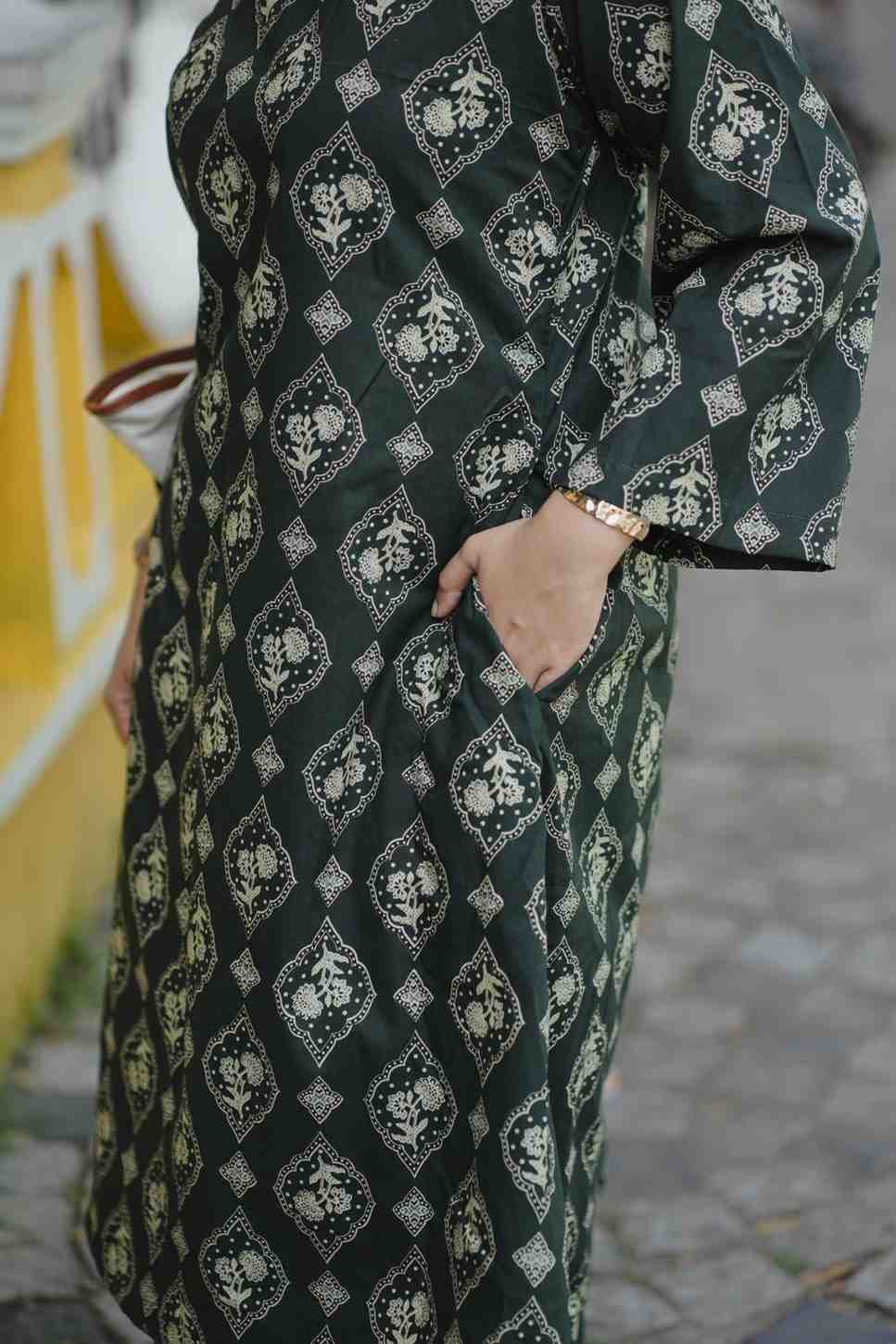 Celebrate the season in style with our deep green printed kurta set, inspired by the calm elegance of winter forests.