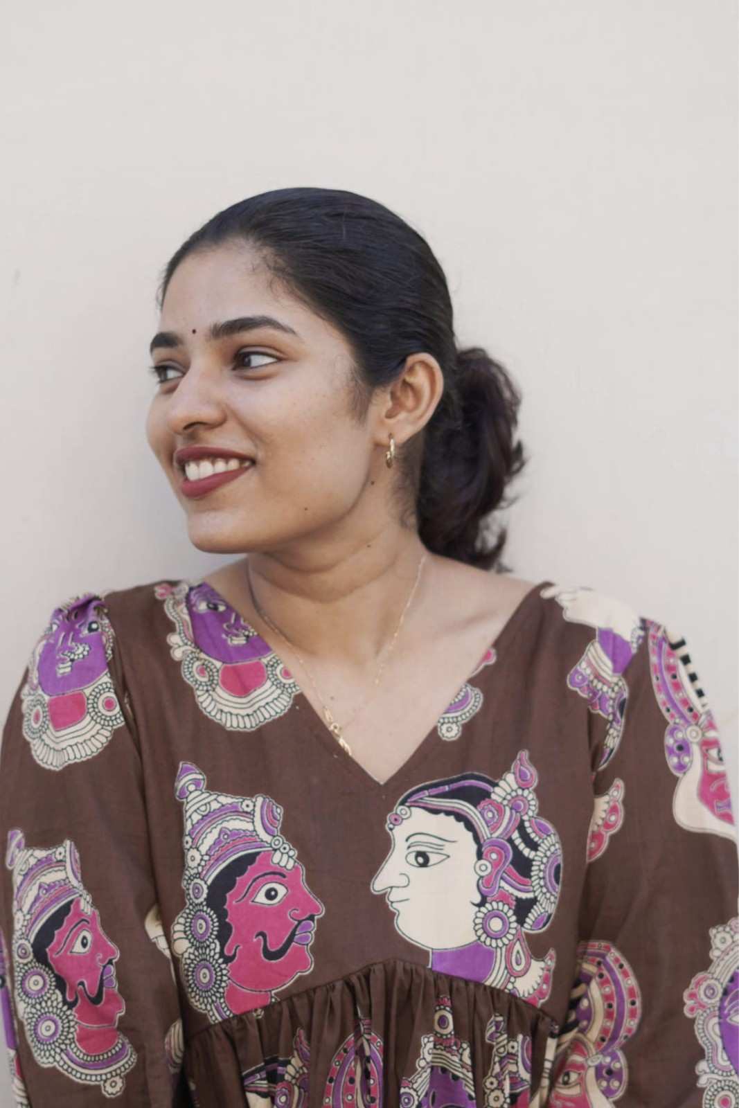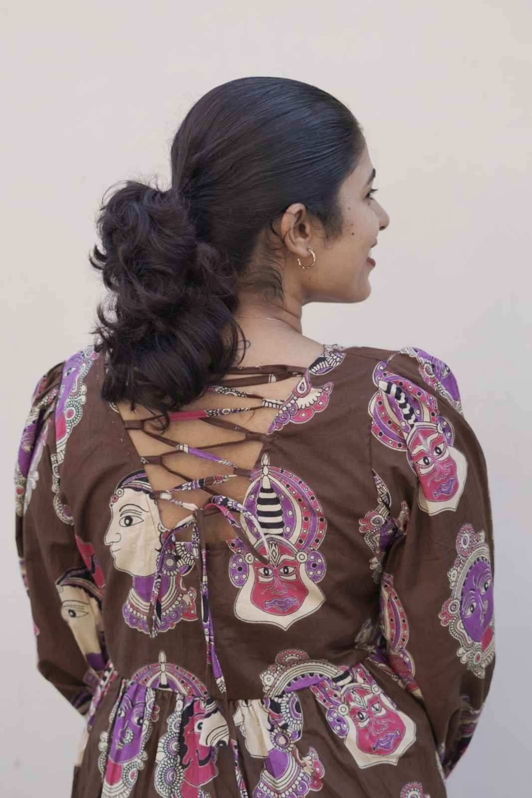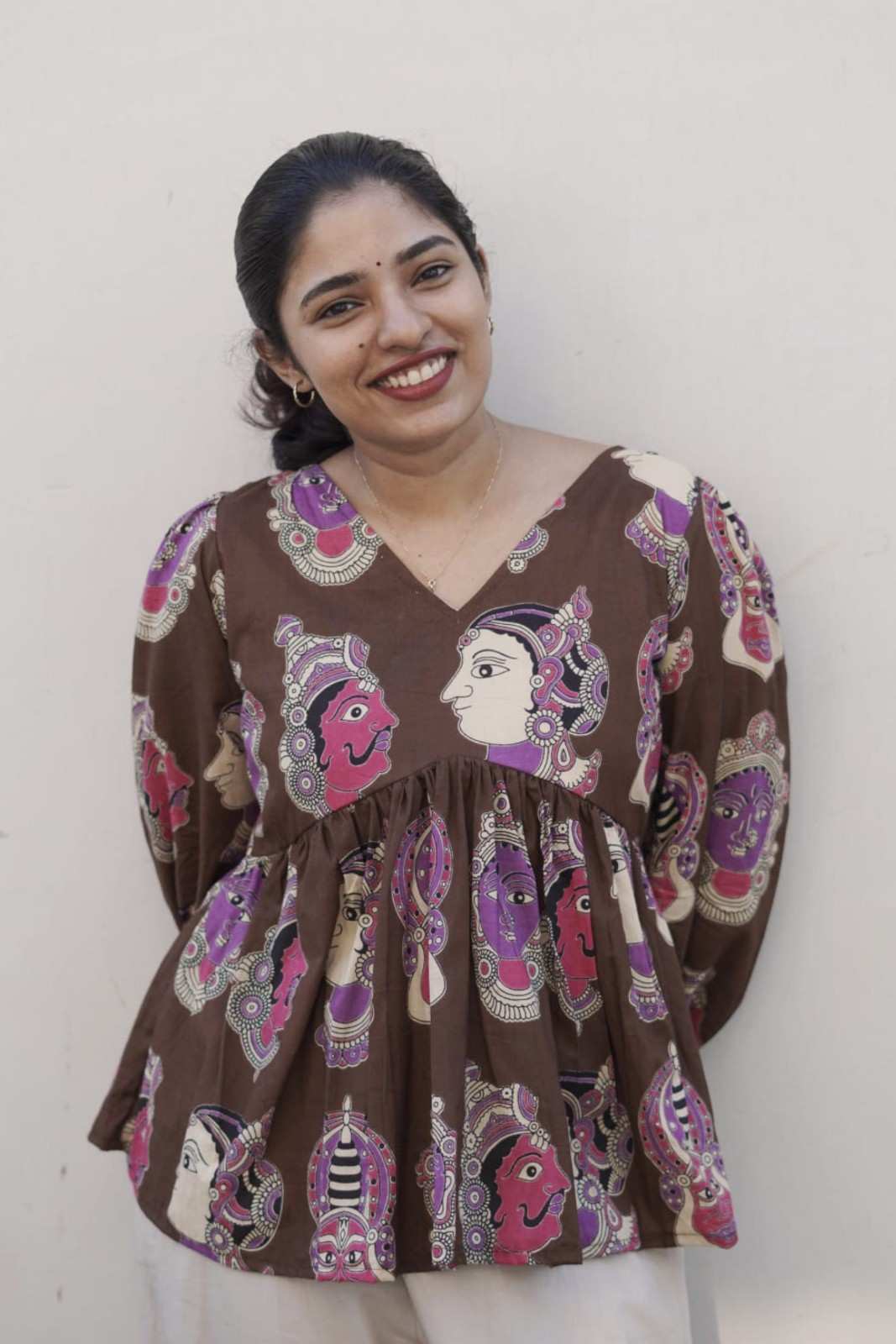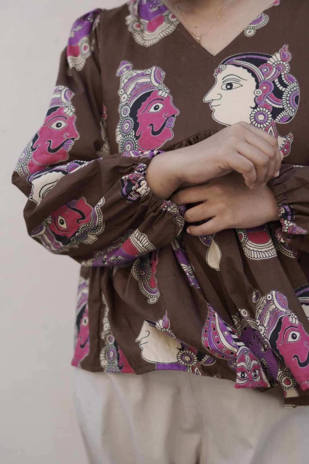Inspired by traditional art motifs, this top blends rich brown tones with vibrant prints for a standout, artistic look.