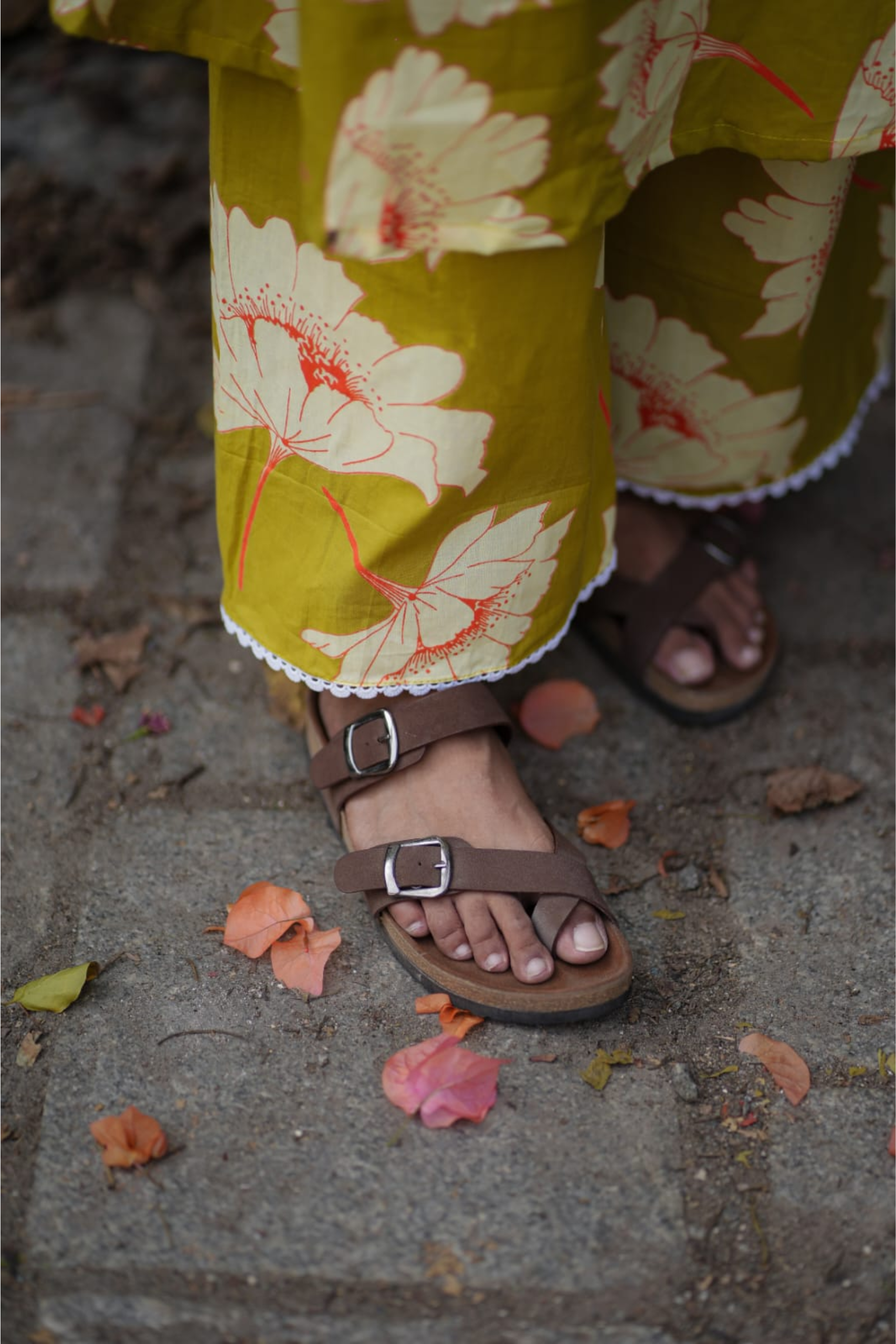 Honey Mustard co-ord set is a celebration of sun-kissed tones and soft floral charm. Designed in a warm honey-mustard hue with delicate botanical prints, this set blends comfort with graceful movement.