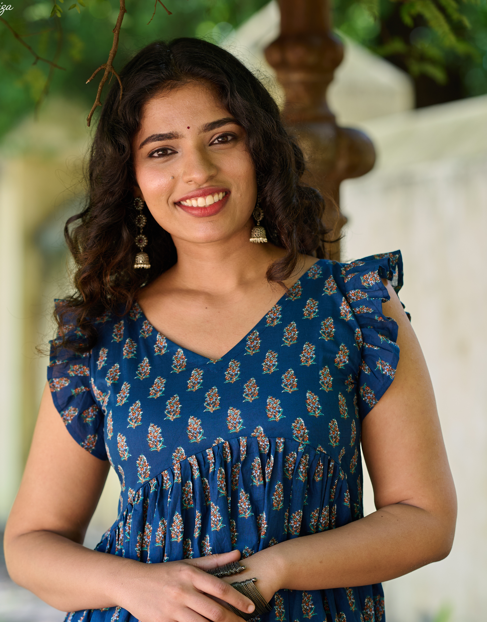 Stay effortlessly stylish with our Indigo Bloom Aaliya Cut Kurta. Designed in soft cotton with golden floral prints, this kurta features a flattering gathered empire cut, sleeveless comfort, and cute tie-up shoulder details. It pairs perfectly with white pants or palazzos for a breezy ethnic-meets-boho look.