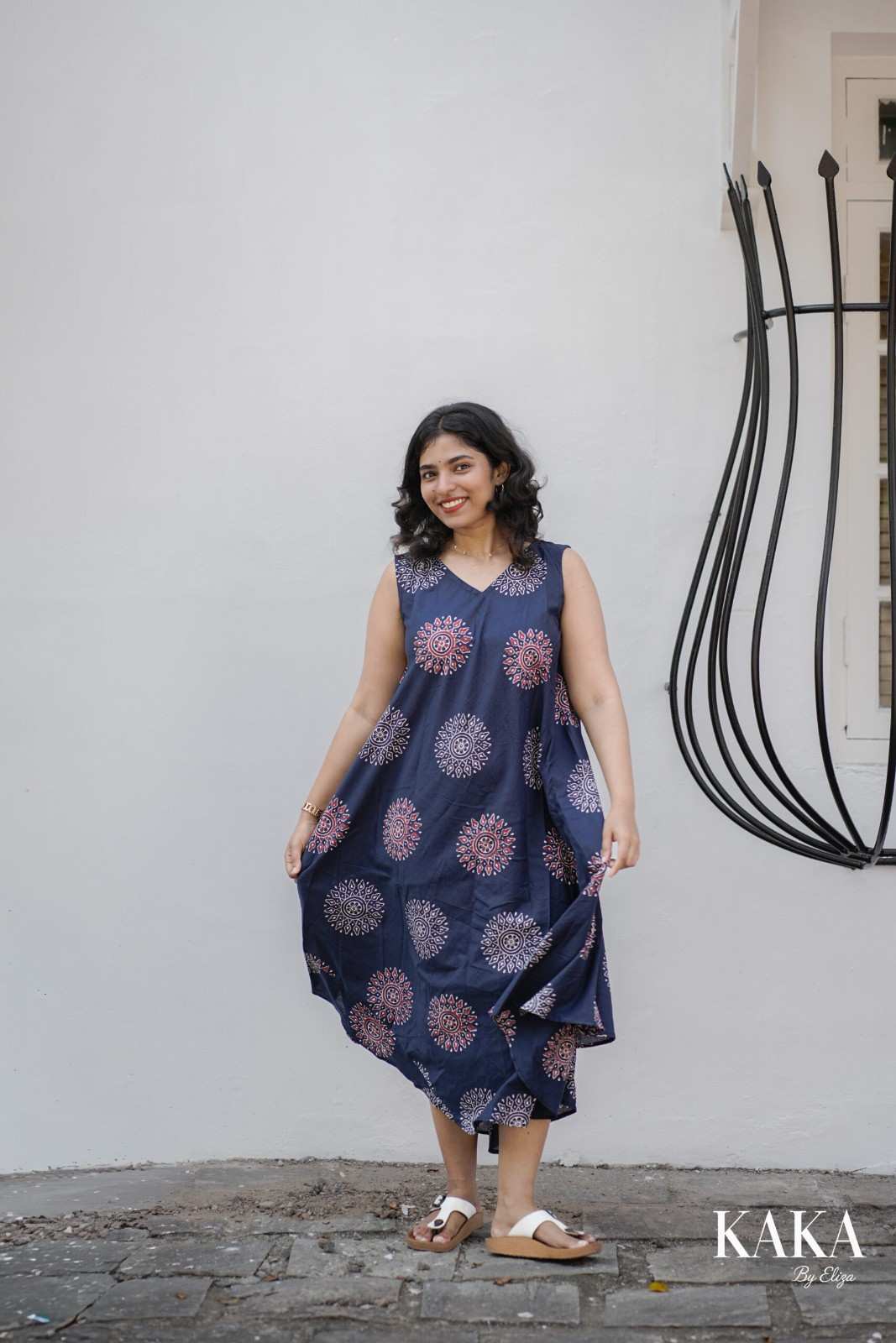Immerse yourself in the calm charm of deep navy and intricate mandala patterns. The Indigo Mandala Dress captures elegance in motion — a sleeveless flared silhouette that drapes effortlessly for everyday ease. Crafted from breathable cotton, this dress blends artistry and comfort, making it the perfect choice for sunny strolls or relaxed evenings.