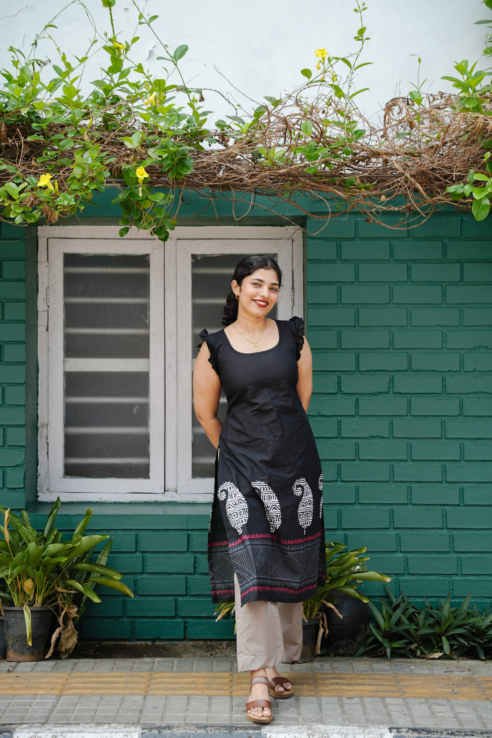Bold, graceful, and rooted in tradition — the Kala Cotton Kurta is crafted from soft breathable cotton in a timeless black hue. Featuring delicate ethnic elephant motifs along the hem and subtle contrast detailing, this kurta brings heritage charm into everyday elegance.