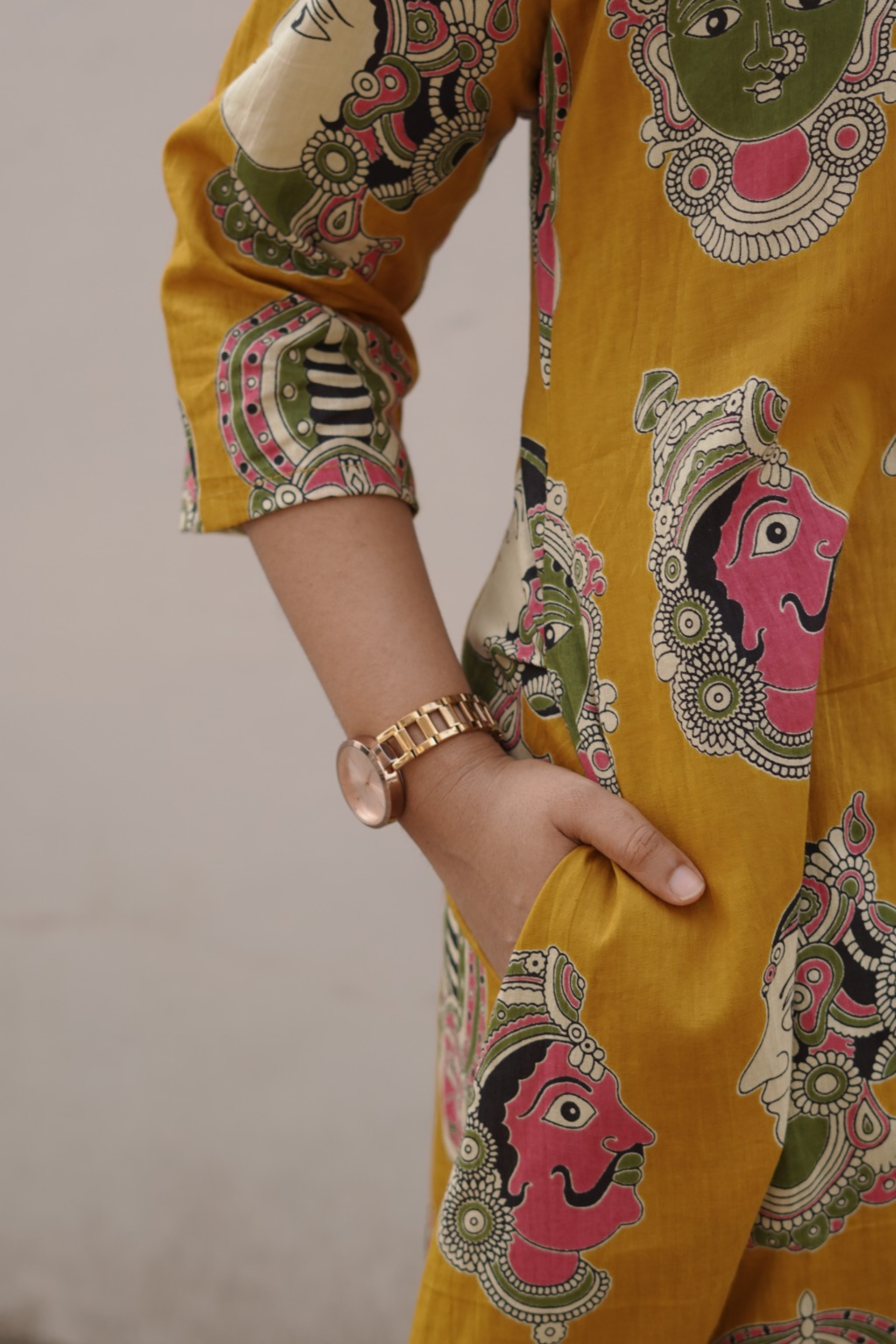 The Kathak Kurti is inspired by Kerala’s iconic mural and Kathakali artistry, beautifully printed over a rich mustard base. Designed in a relaxed silhouette with three-quarter sleeves, this piece blends heritage with contemporary comfort.