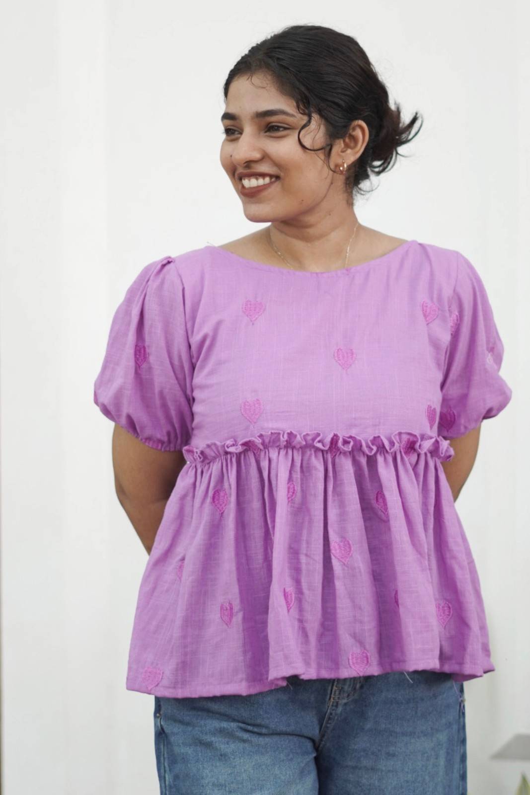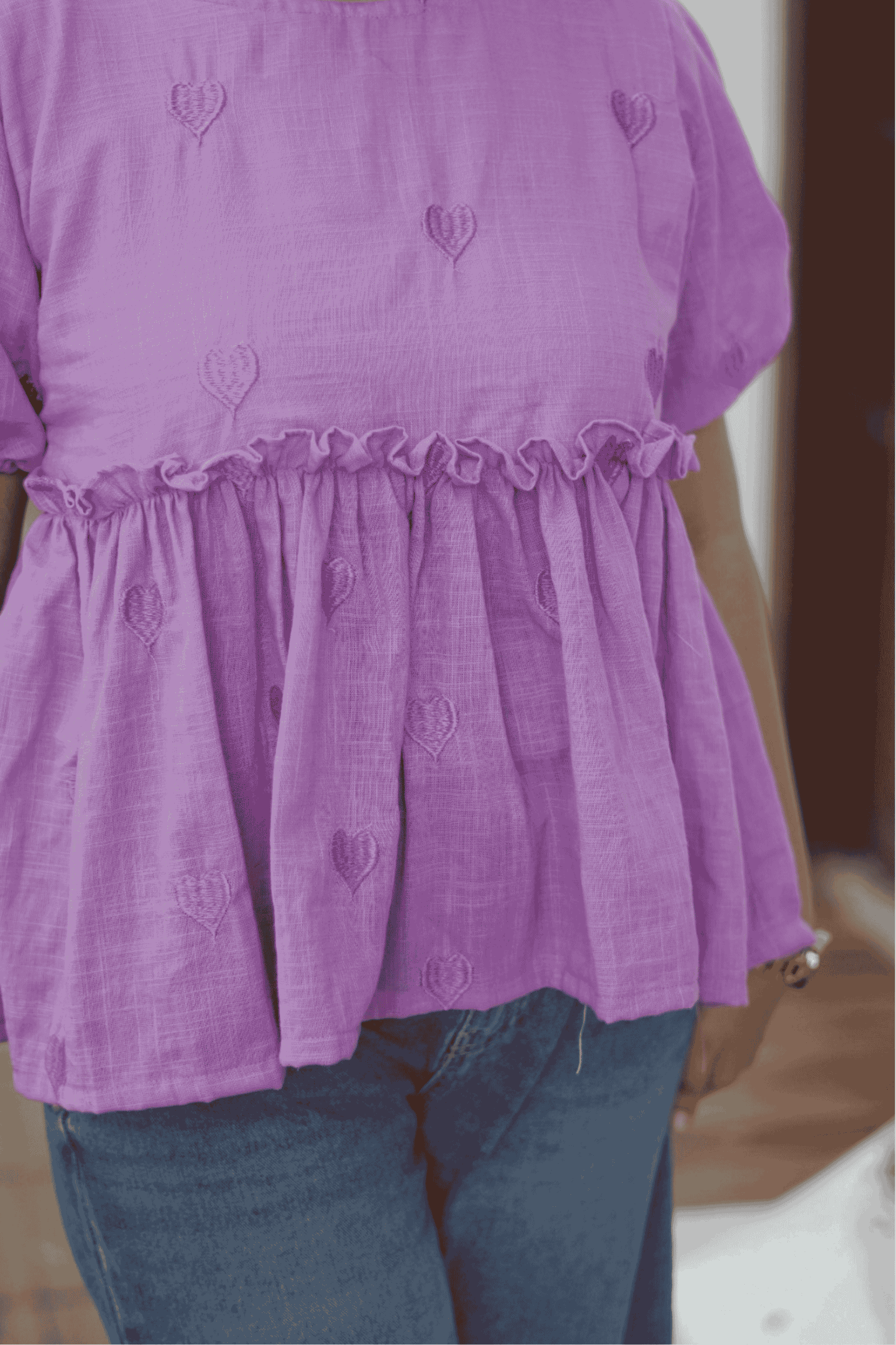 A soft lavender top with delicate heart motifs, designed to bring a sweet and charming vibe to your everyday style.