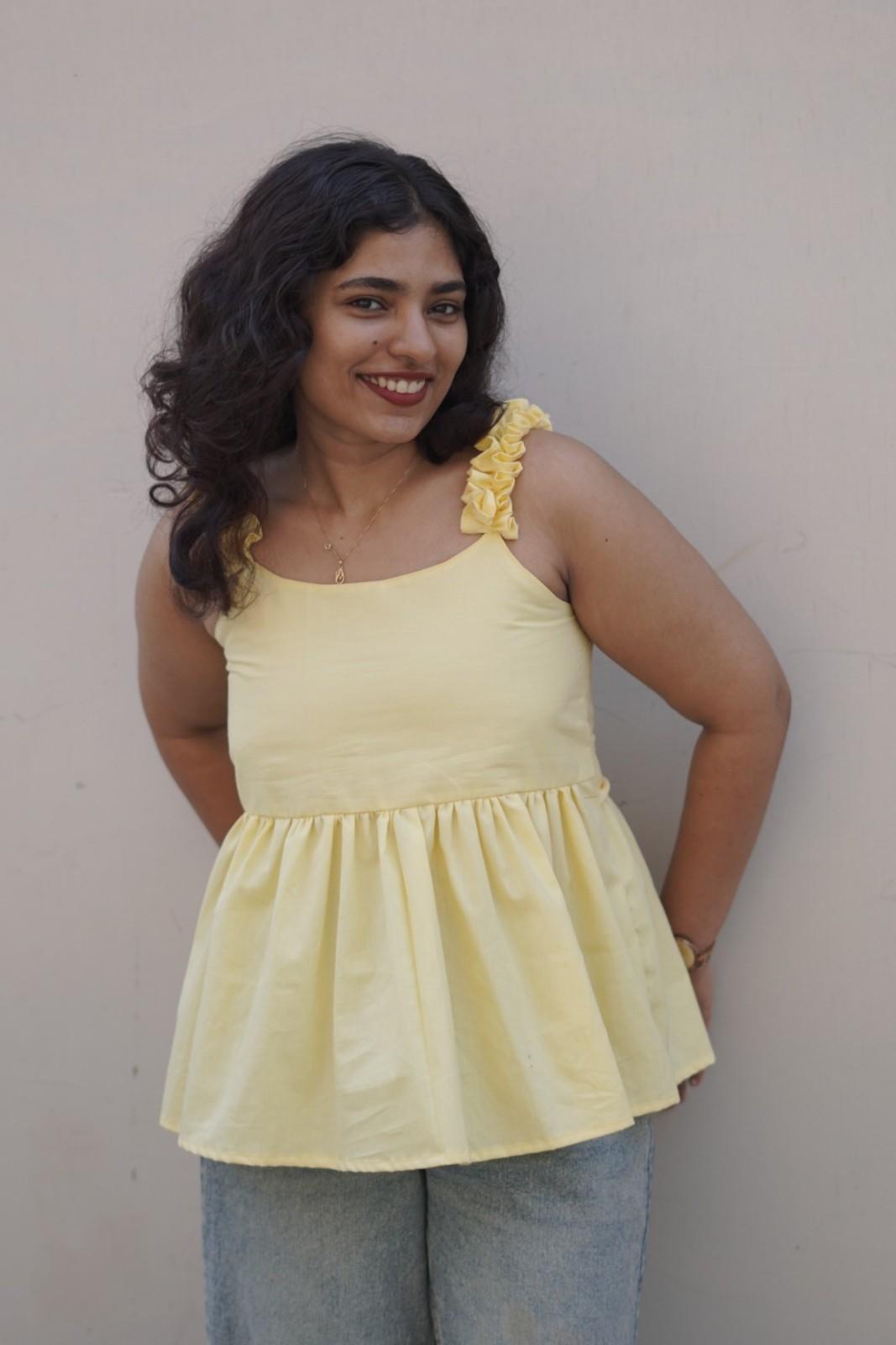 A sweet and breezy yellow peplum top designed with cute ruffled straps and a flowy silhouette. Light, playful, and perfect for sunny days, this top adds a soft feminine charm to your everyday outfits. Pair it with jeans, skirts, or shorts for an effortlessly cute look. ☀️