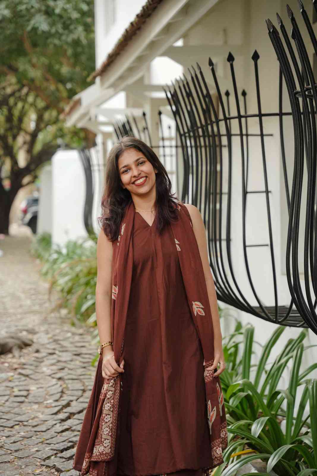 Inspired by the earthy beauty of Kerala, the Meher Kurta Set brings together comfort, simplicity, and timeless Indian elegance. The soft cocoa brown shade paired with subtle ethnic detailing creates a calm yet graceful look. Designed for effortless wear, this kurta set with matching pants and dupatta is perfect for women who love understated traditional fashion.