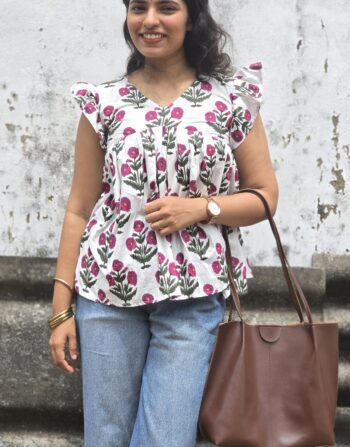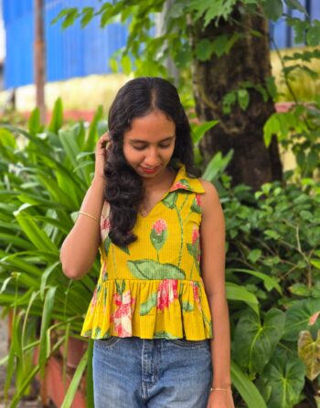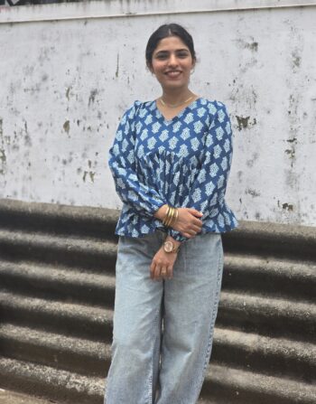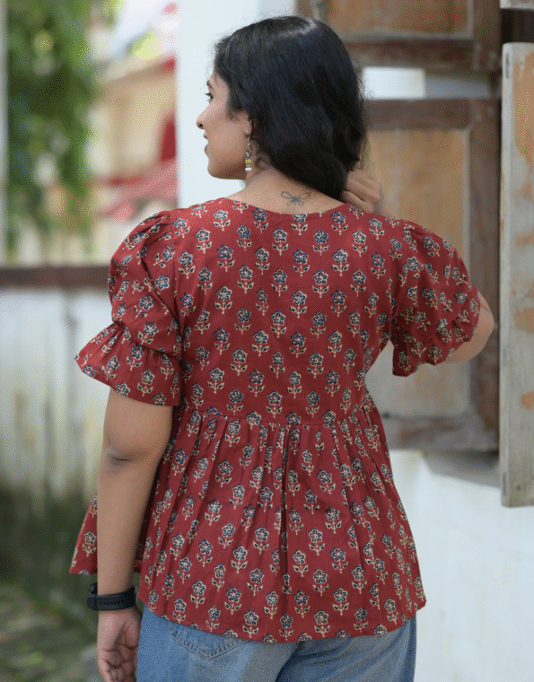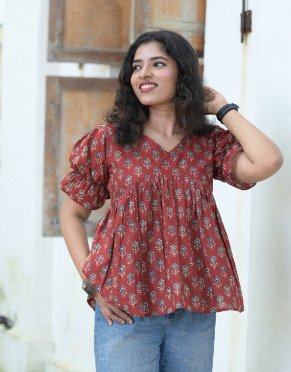 Elevate your casual chic with this Meron Peplum Top. Featuring delicate traditional prints and playful ruffle sleeves, this top is both fun and feminine. The flattering V-neck and gathered waist create a breezy silhouette that pairs perfectly with jeans, palazzos, or skirts. Whether you’re heading to a café or a craft fair, this top keeps you stylish and comfortable all day long.