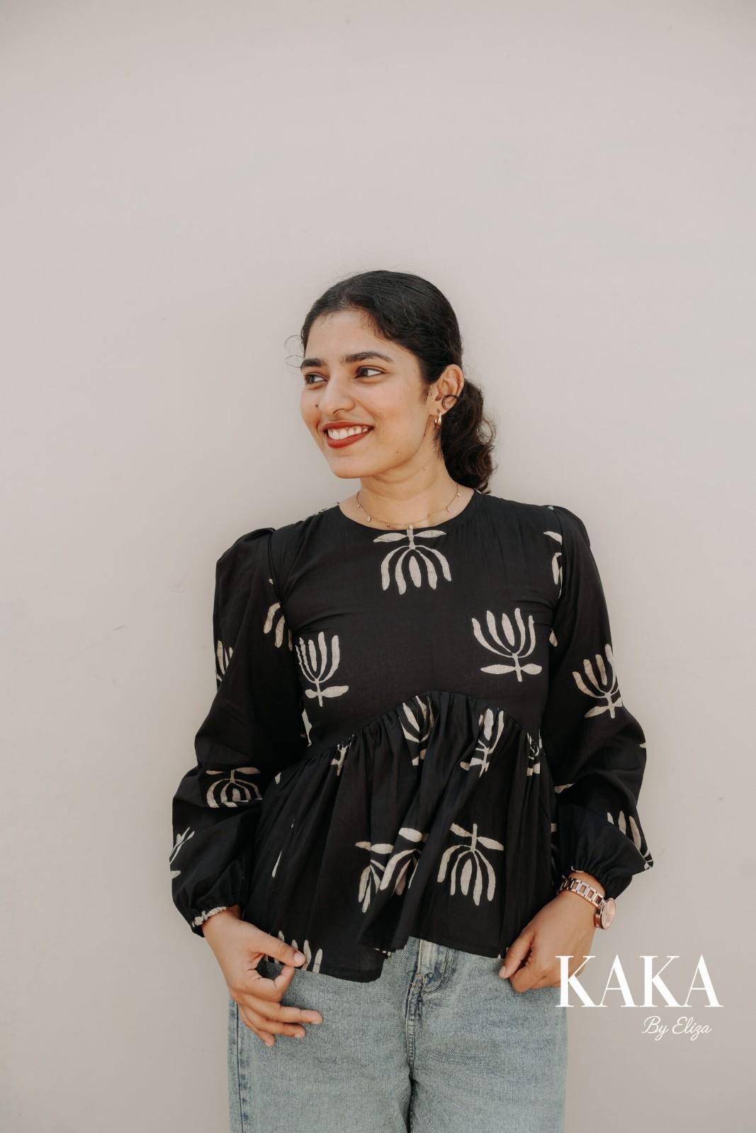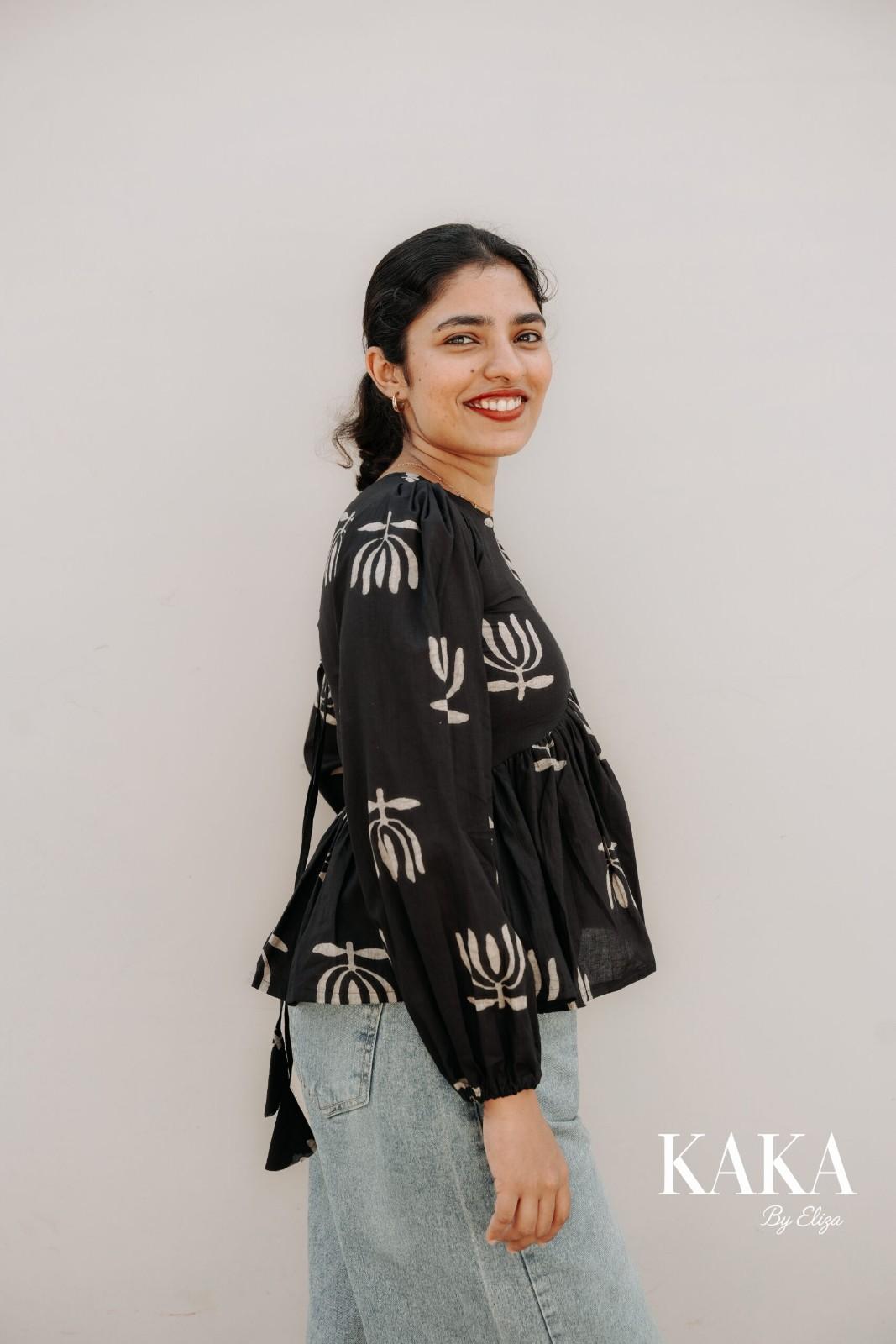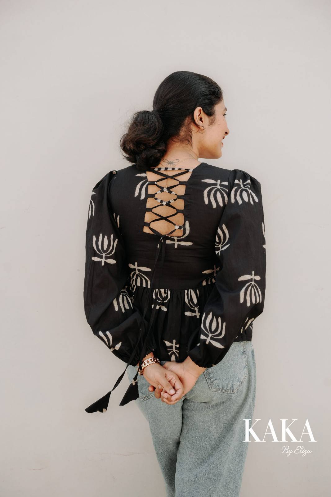 Crafted from soft, breathable pure cotton, this timeless black top features hand block-printed floral motifs in muted ivory tones. The round neckline and lace-up back gives it a clean, classic look, perfectly balancing the voluminous puffed sleeves and the gentle gathered peplum waist for a flattering silhouette.