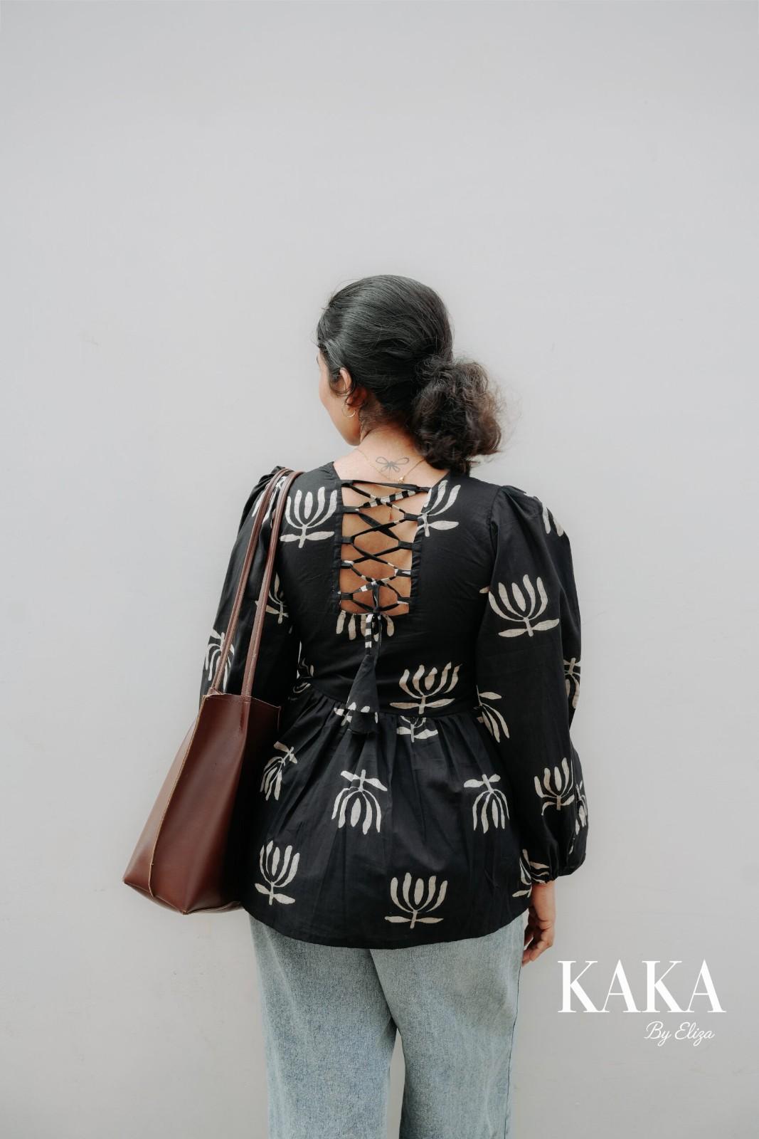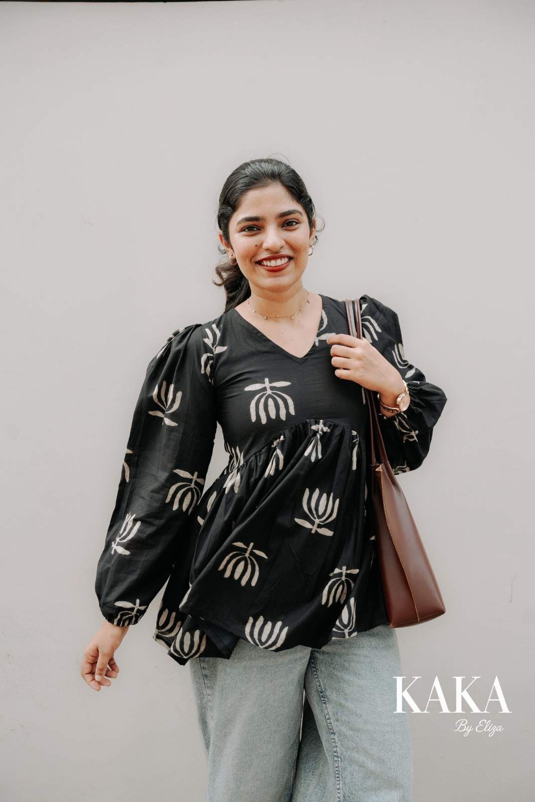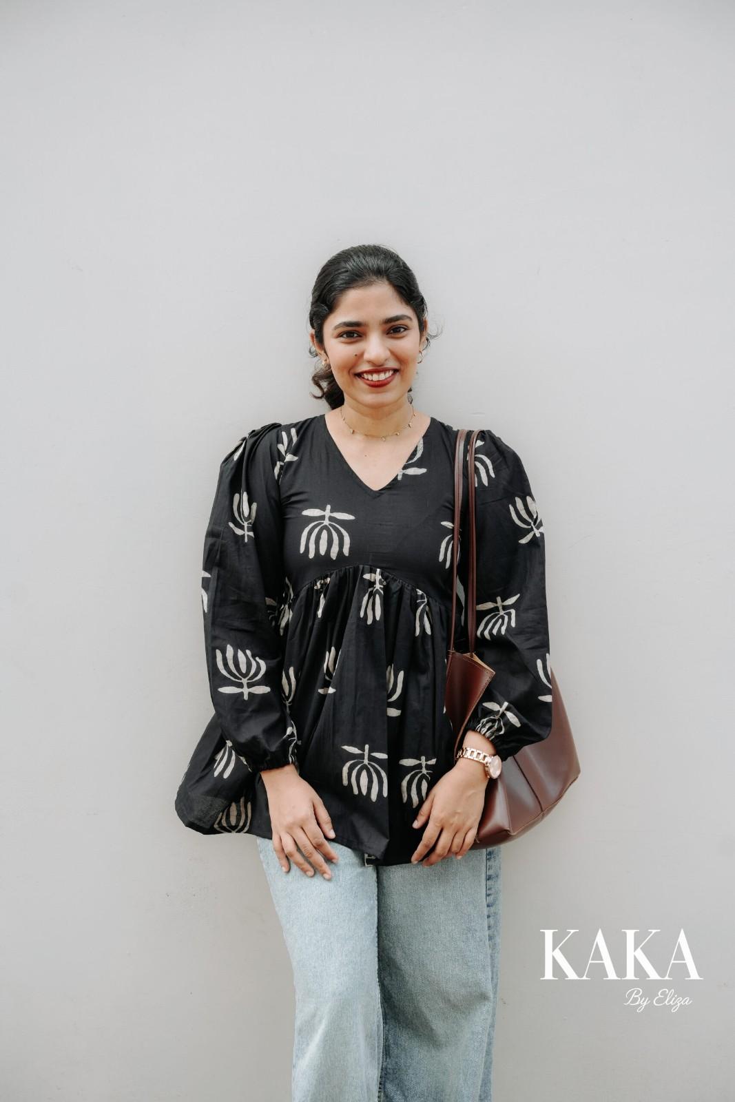 This signature black printed top is specially designed by KAKA, blending modern chic with artisanal charm 🖤
