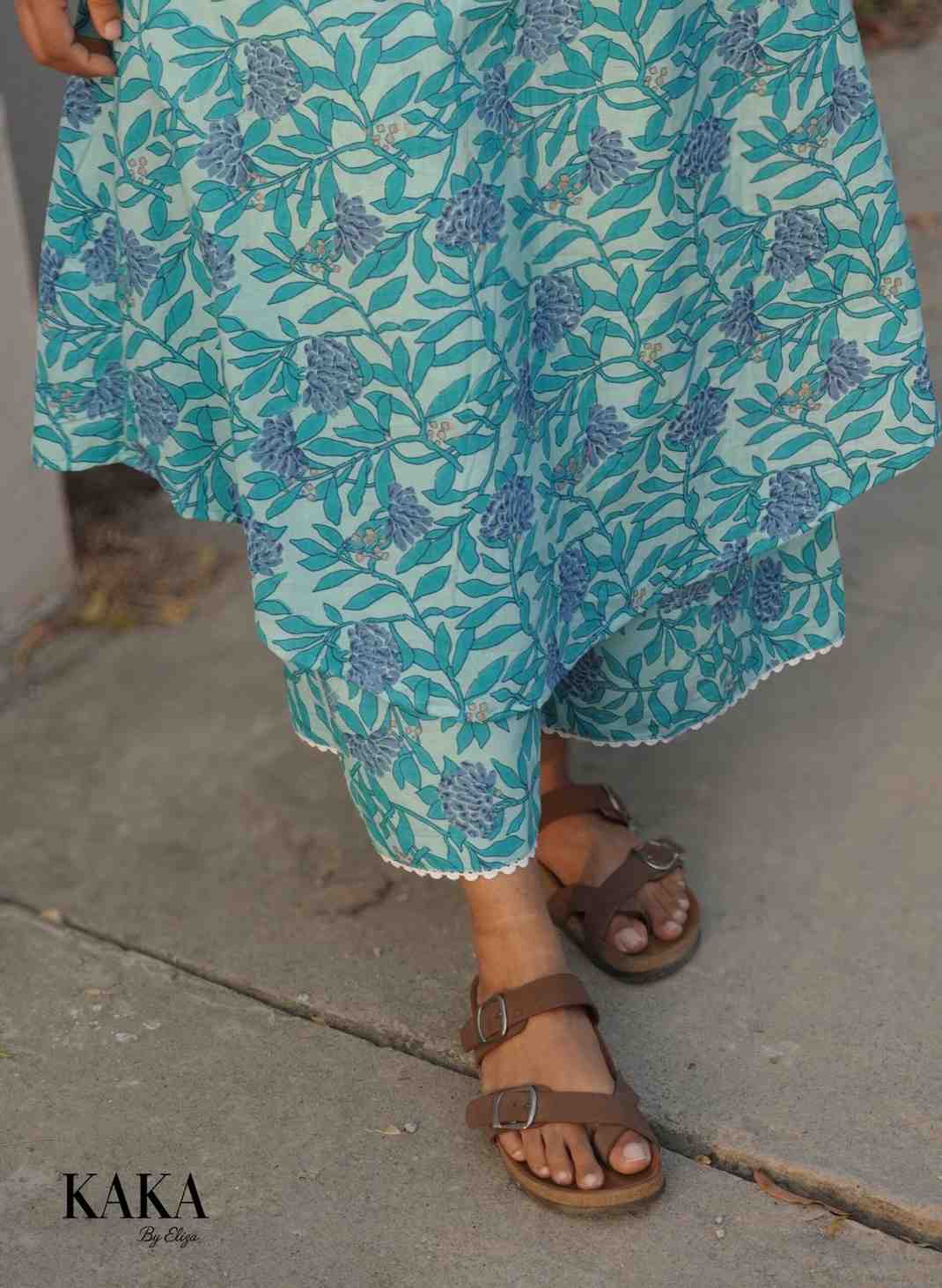 Step into effortless freshness with our Mint Grace Co-ord set. Designed in a soothing mint-aqua shade with delicate floral vine prints, this silhouette captures the beauty of a Kerala garden in bloom.