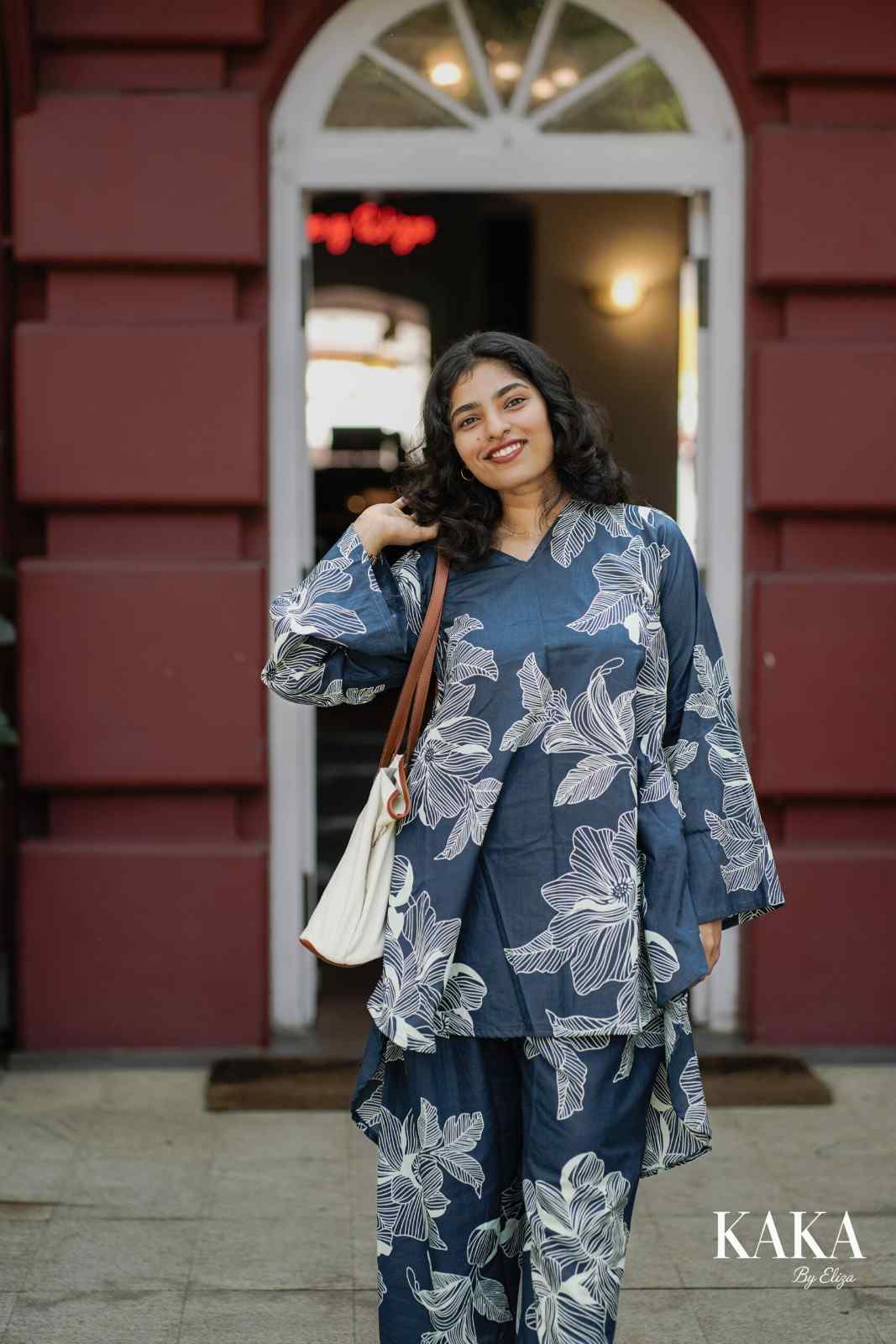 Slip into easy elegance with the Moonlit Flora Co-ord Set, crafted in a rich navy base adorned with oversized floral prints. The top features a stylish high–low hemline that brings a graceful flow to every step, while the relaxed-fit pants complete the look with effortless charm.