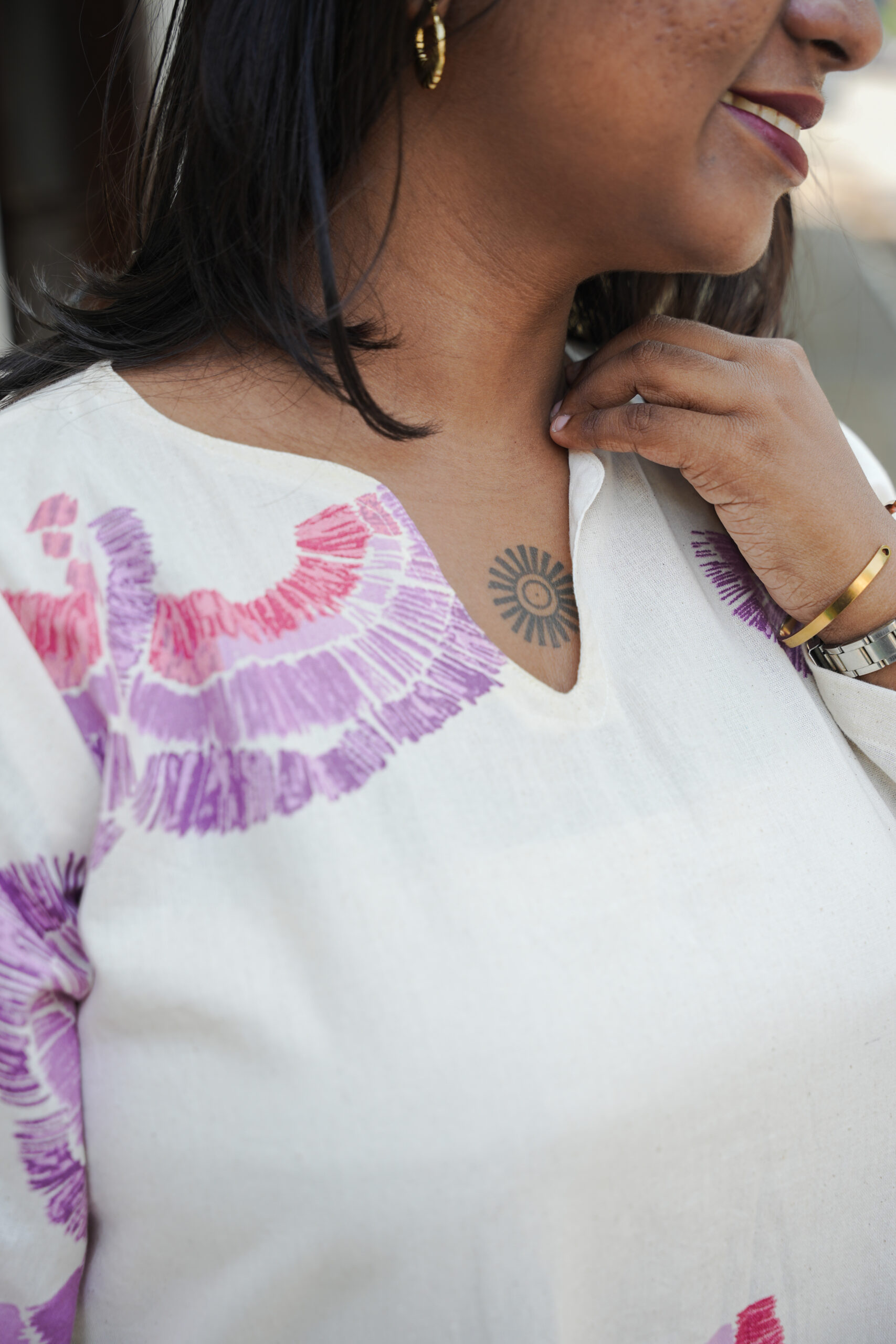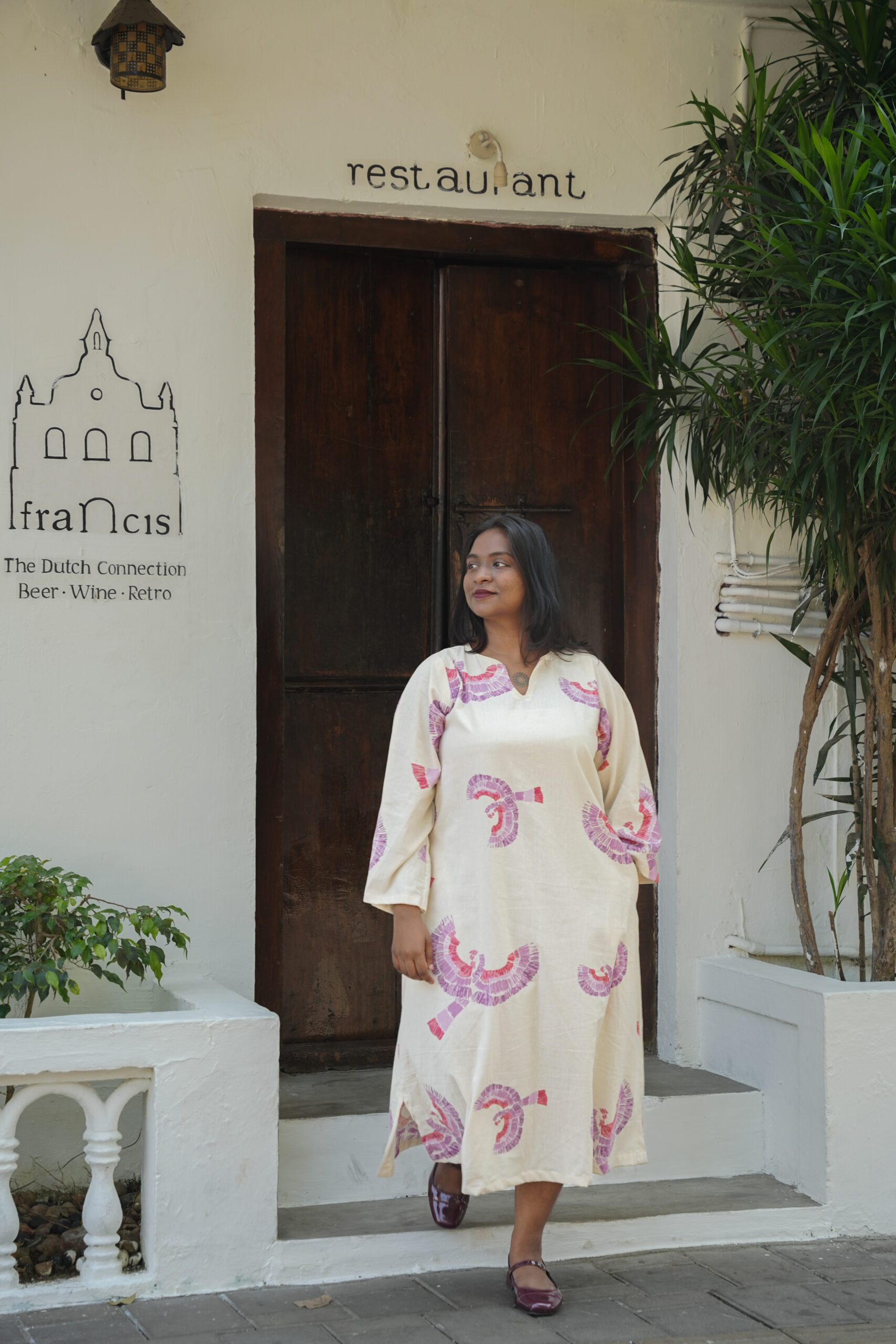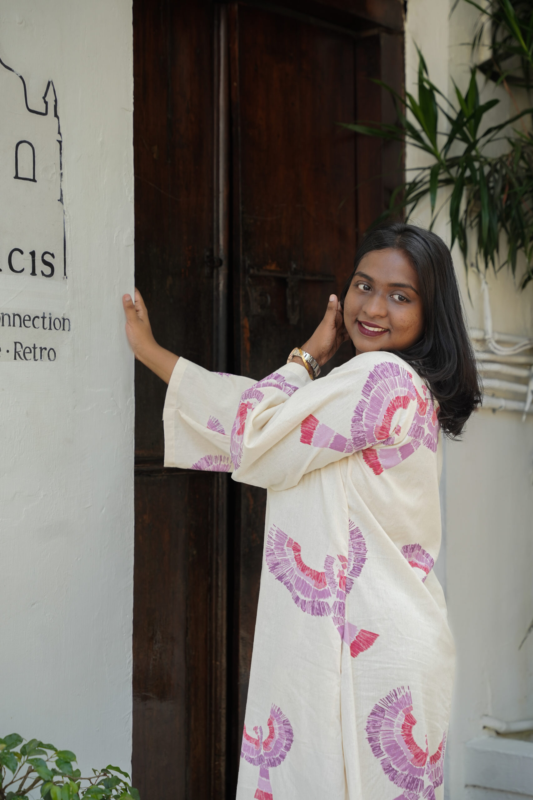 Gracefully understated and endlessly wearable, the Mridula Dress is crafted for women who love soft elegance. Featuring delicate pastel motifs on a creamy ivory base, this dress brings a calm, refined charm to everyday dressing.
