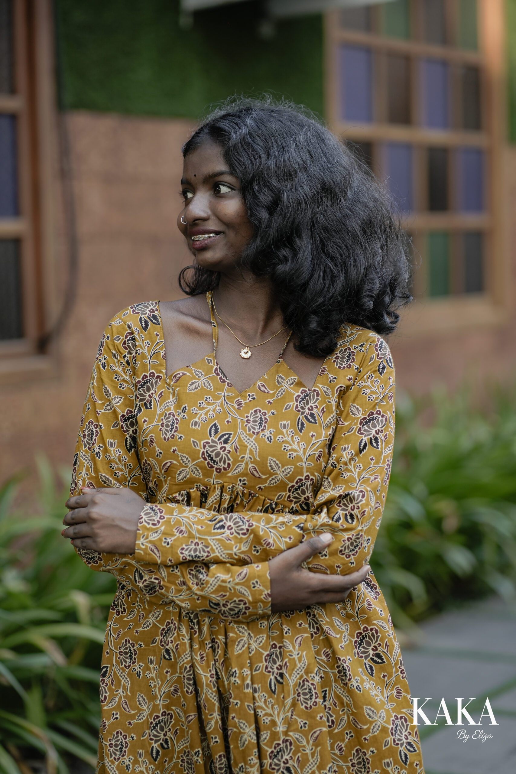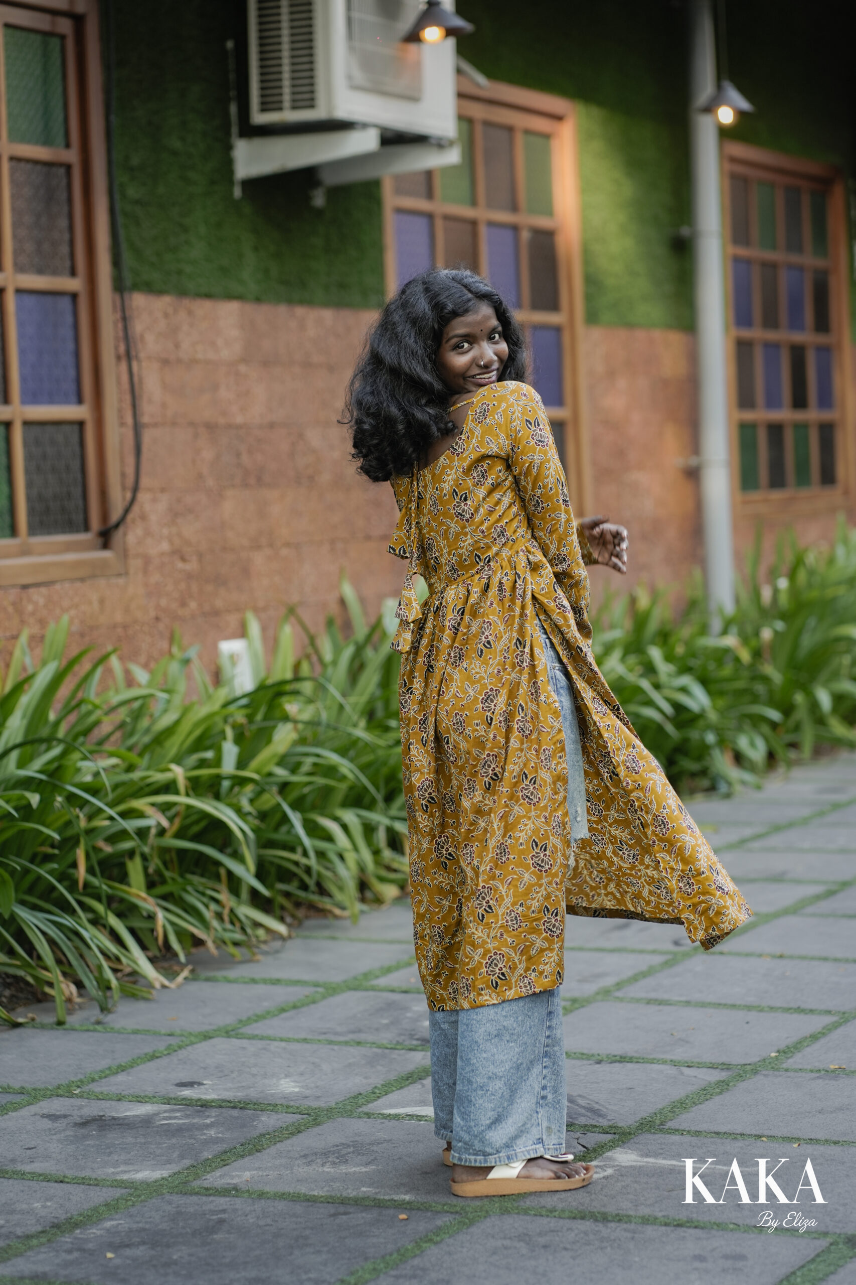 Step into a blend of tradition and comfort with our mustard floral printed long kurti.