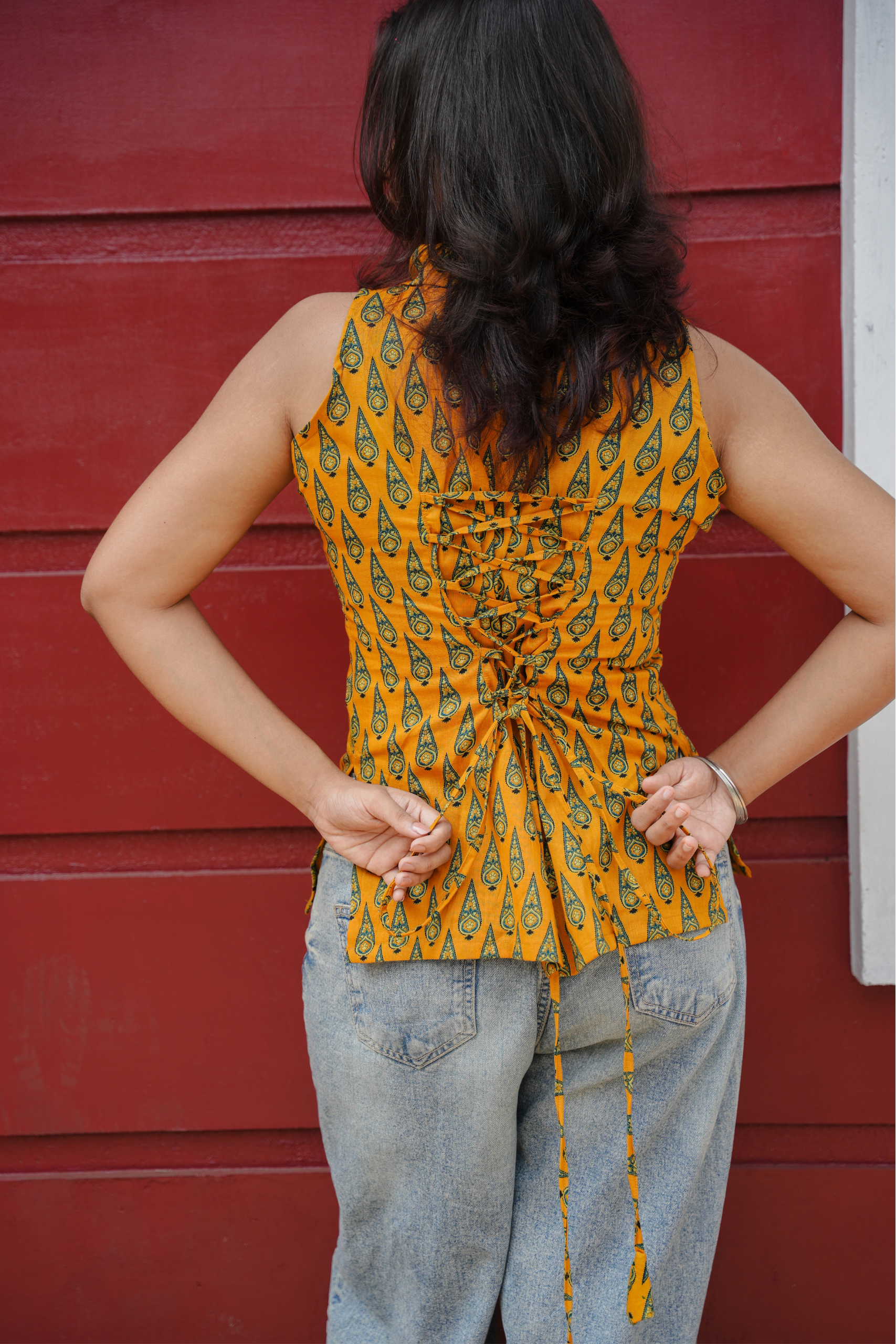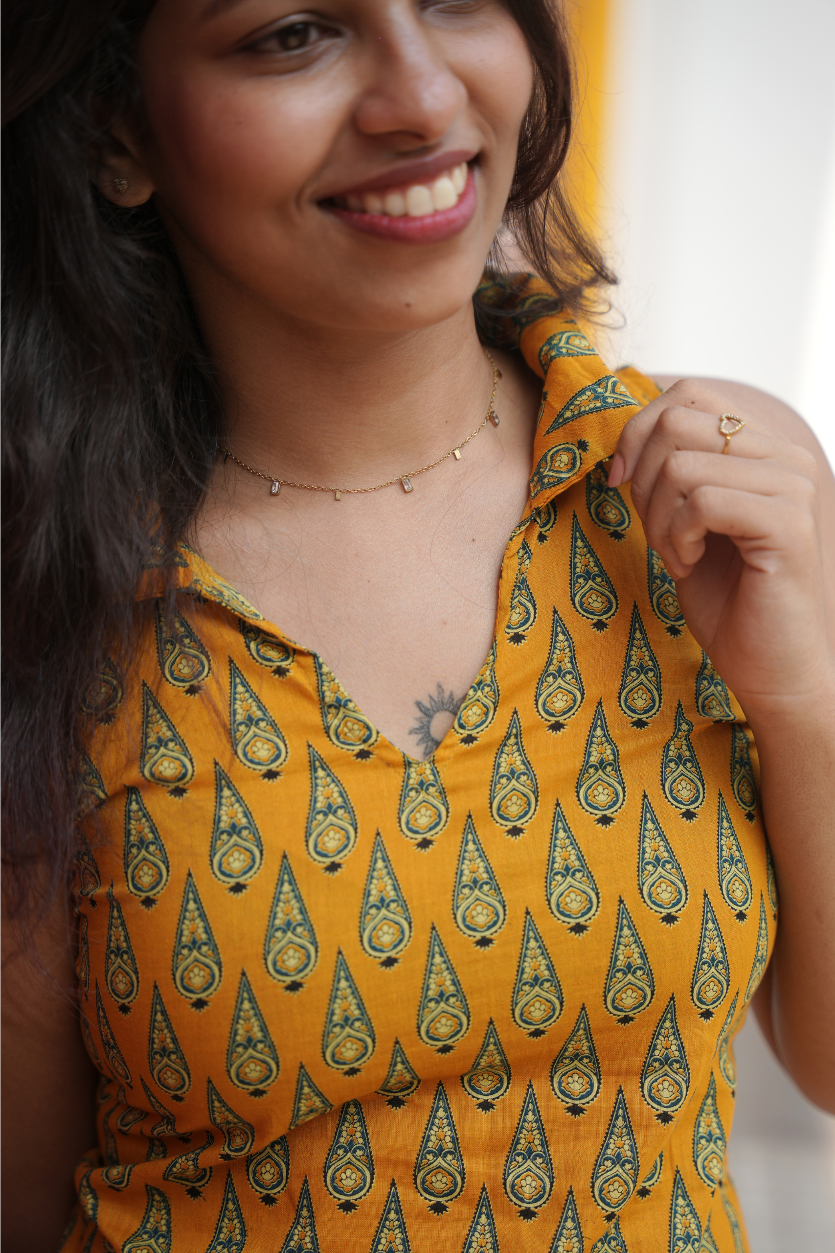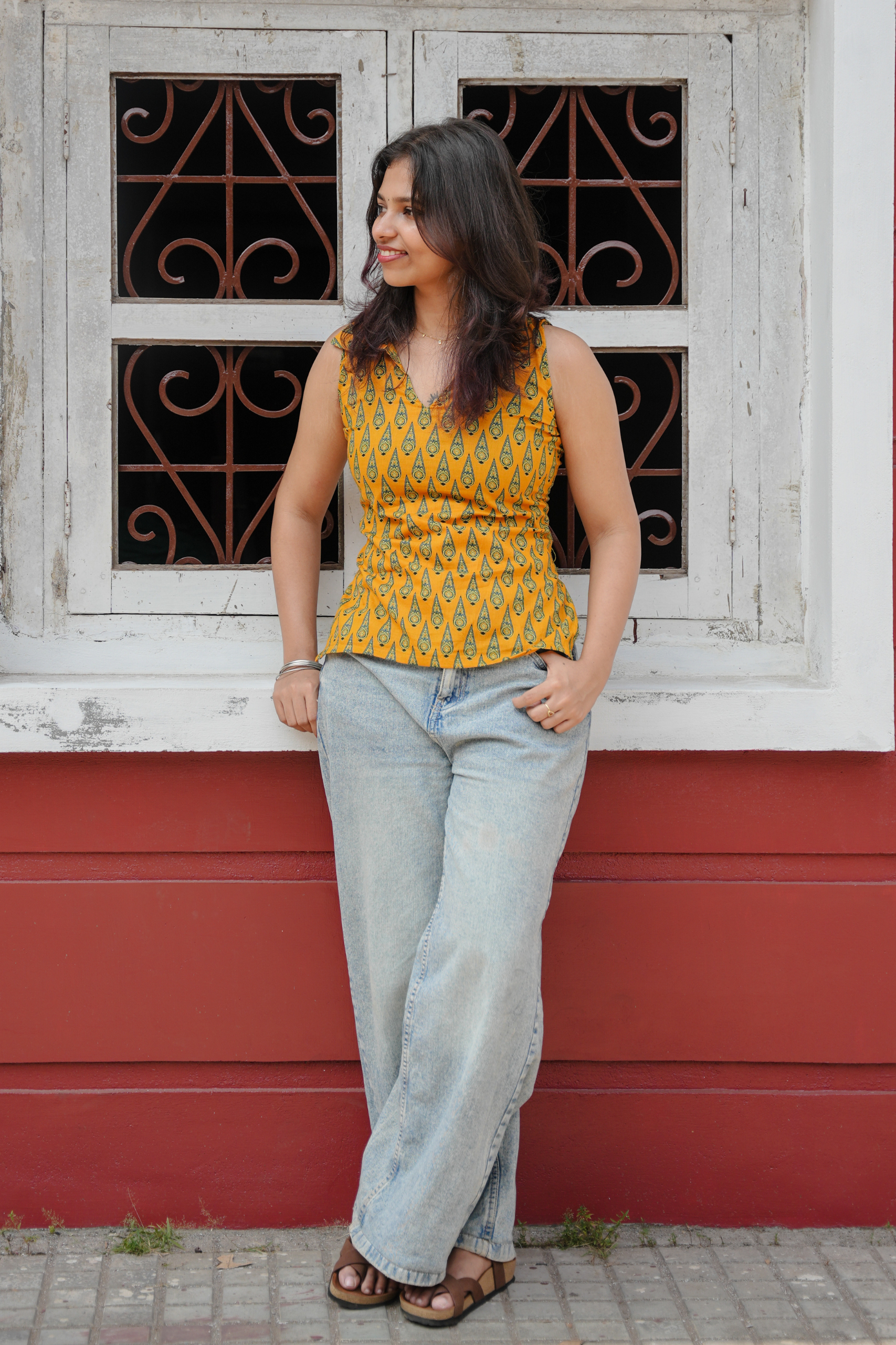 Bright, breezy, and beautifully rooted in Indian aesthetics, the Nilah Top is designed for effortless everyday styling. The warm mustard shade with traditional-inspired prints brings a subtle Kerala charm, while the modern sleeveless cut makes it perfect for pairing with jeans, trousers, or skirts. A perfect blend of ethnic soul and casual comfort.