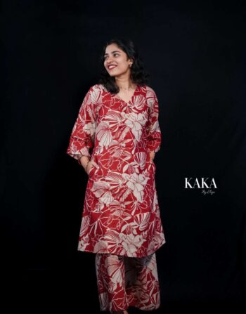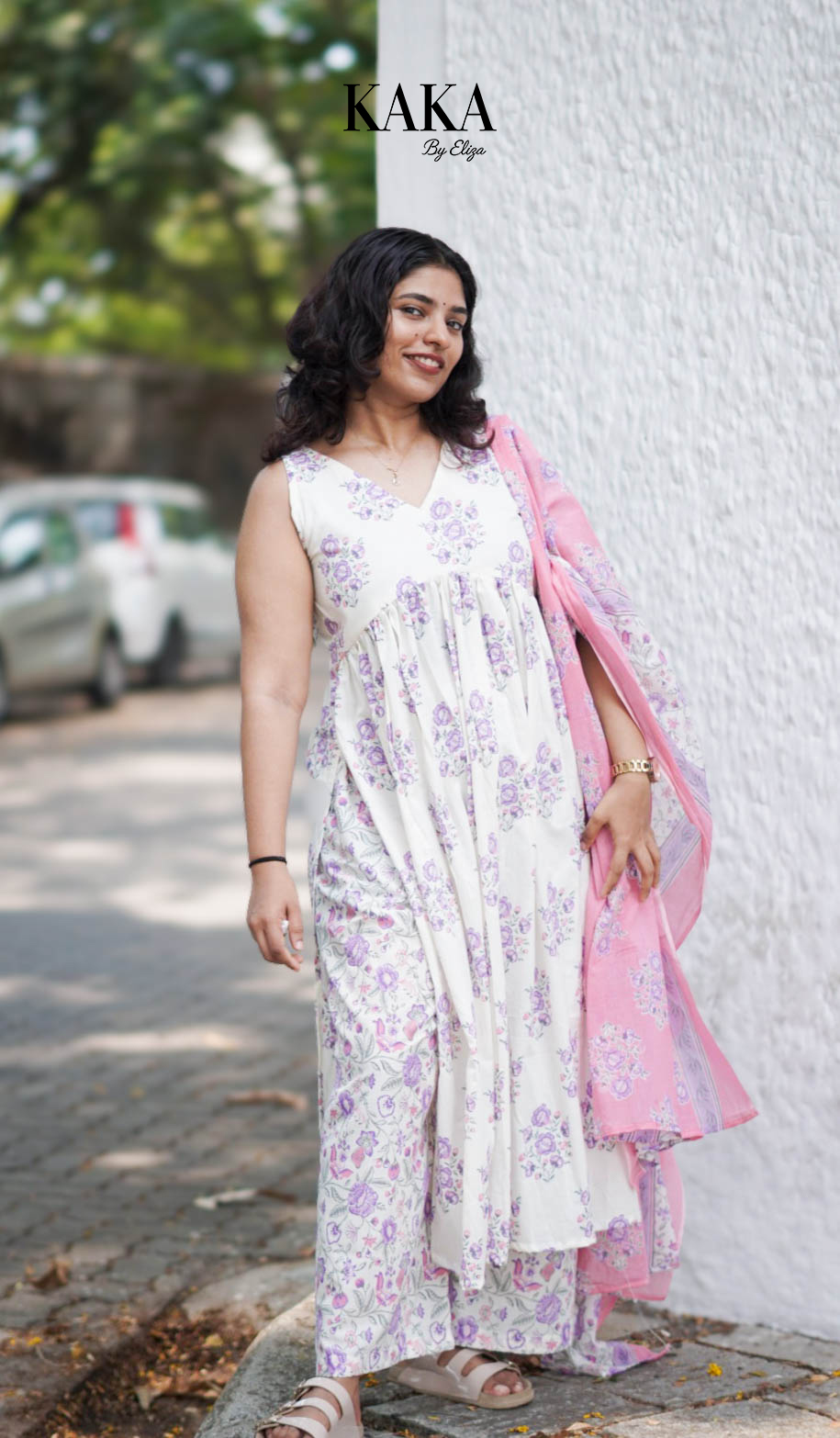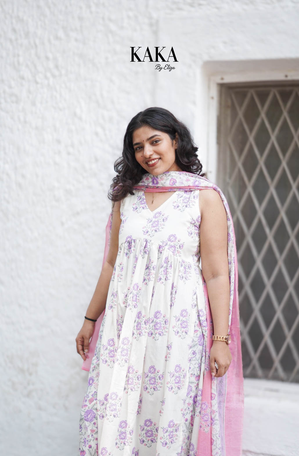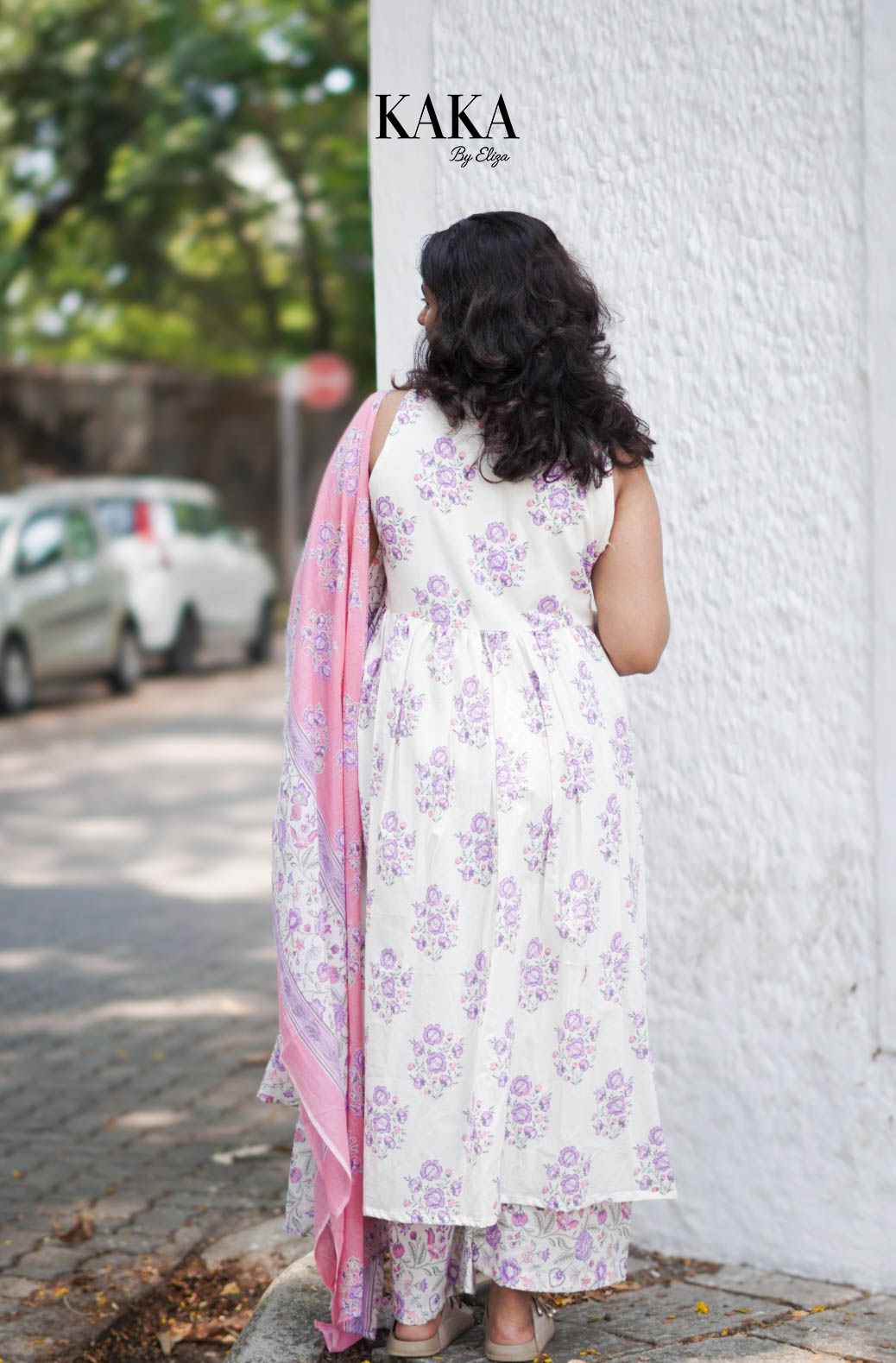 The soft lavender and pink floral motifs on a crisp ivory base create a look that is both refreshing and timeless. Whether you’re heading to a morning temple visit, a family lunch, or a day out in the city, this set ensures you stay cool and look radiant.