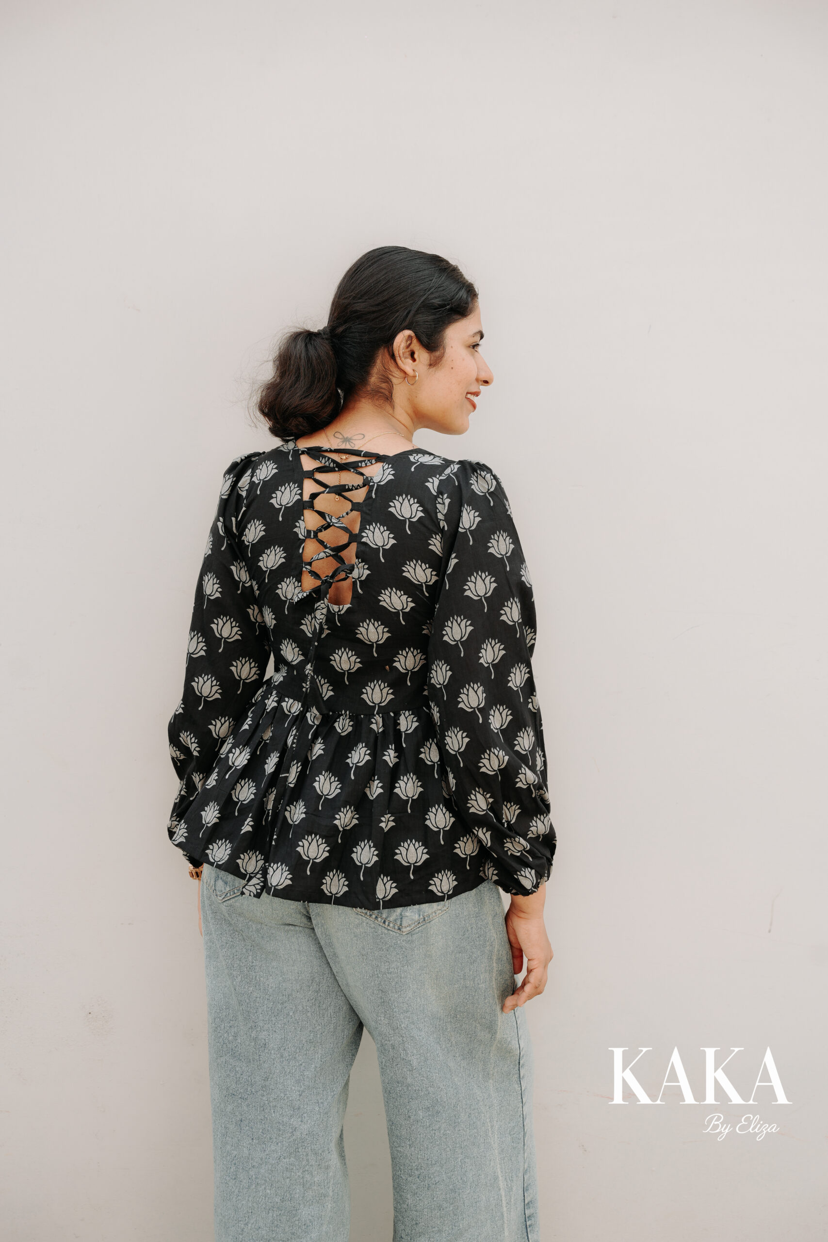 Black handcrafted peplum top with elegant silver floral block prints and a lace-up back. Designed for comfort and style, this cotton piece from KAKA By Eliza blends modern femininity with traditional charm — perfect for casual days or chic evenings.