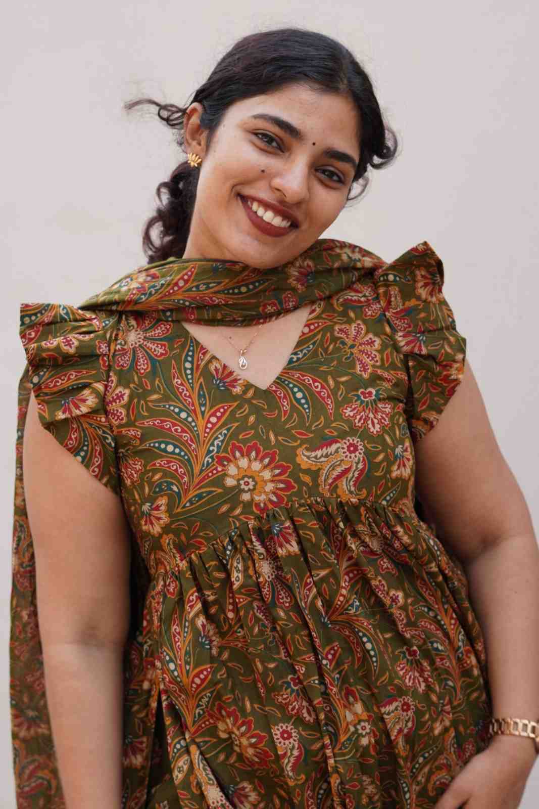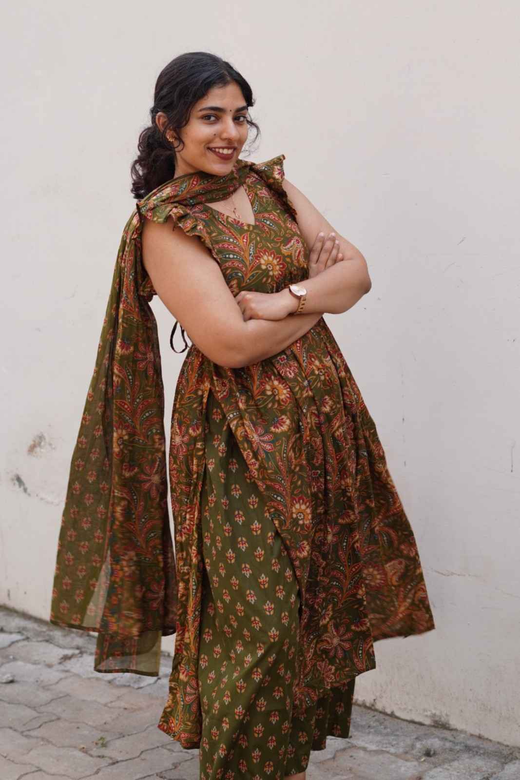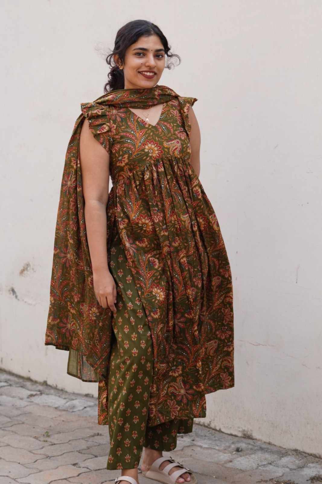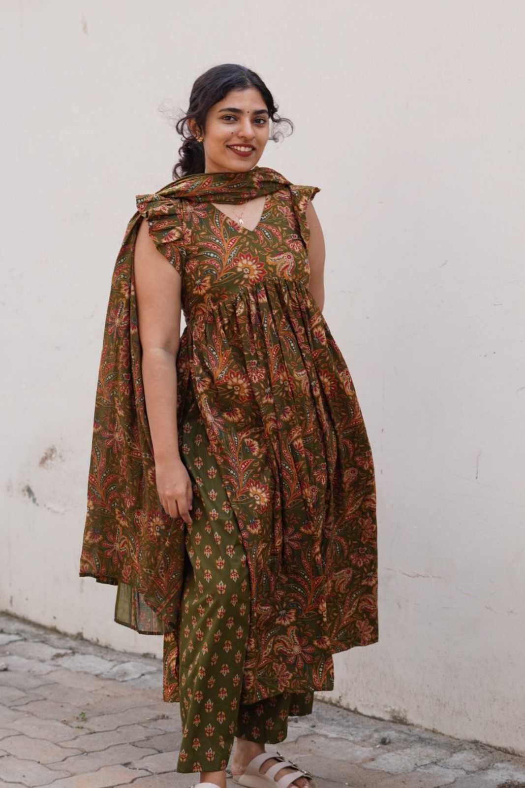 Olidhara is a timeless celebration of earthy elegance and traditional artistry. Designed in a rich olive green base adorned with intricate paisley and floral motifs, this three-piece set blends cultural depth with modern sophistication.