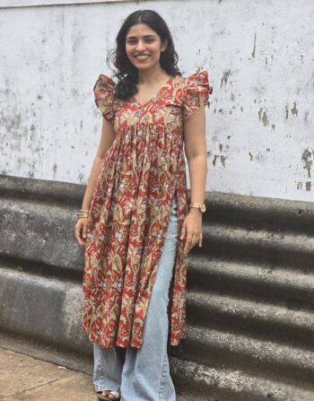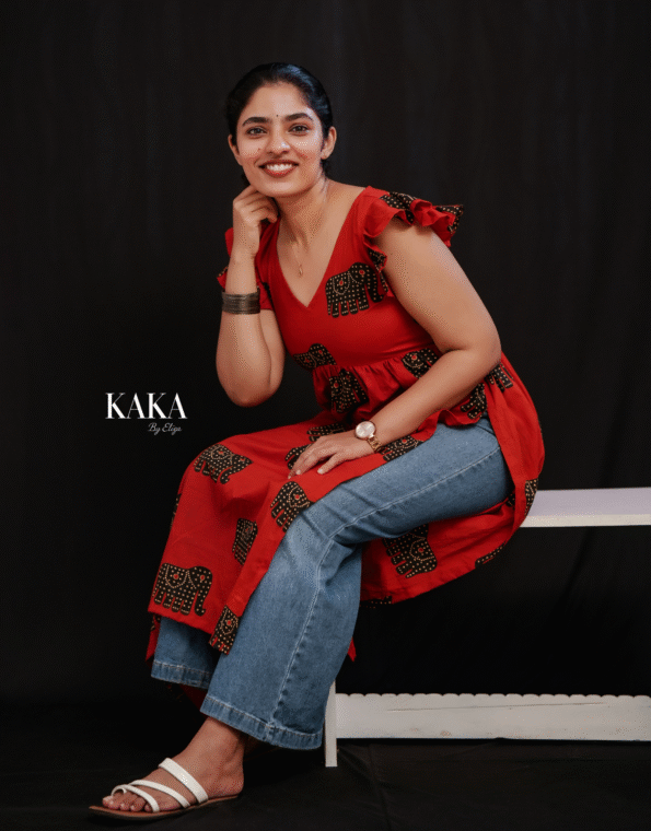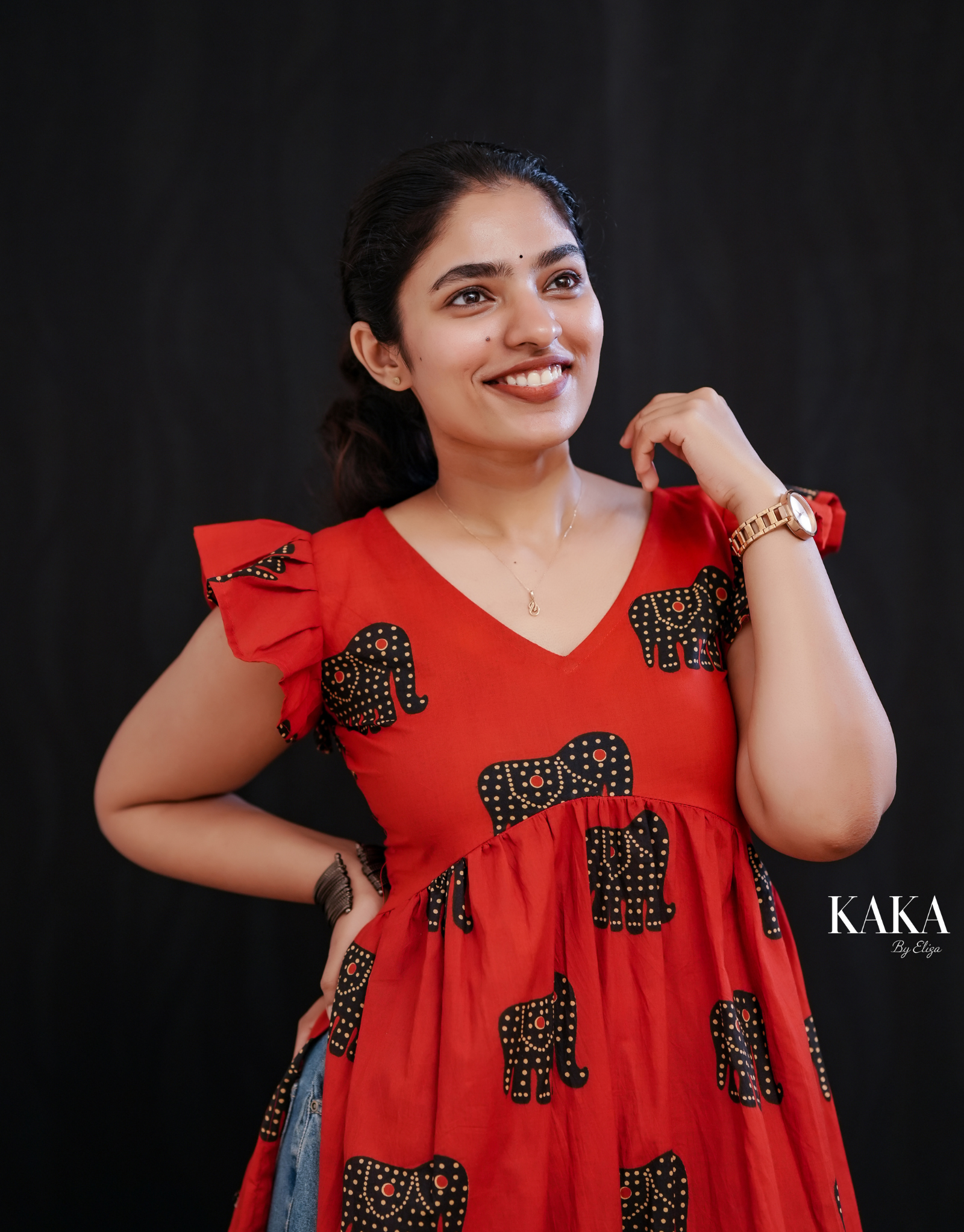 our vibrant red kurthi adorned with artistic black elephant prints. Designed with flutter sleeves and a deep V-neck, this piece blends traditional motifs with a trendy silhouette. The side slit adds comfort and flair, making it ideal for pairing with jeans or trousers. Perfect for day outs, casual events, or just adding joy to your everyday wear.