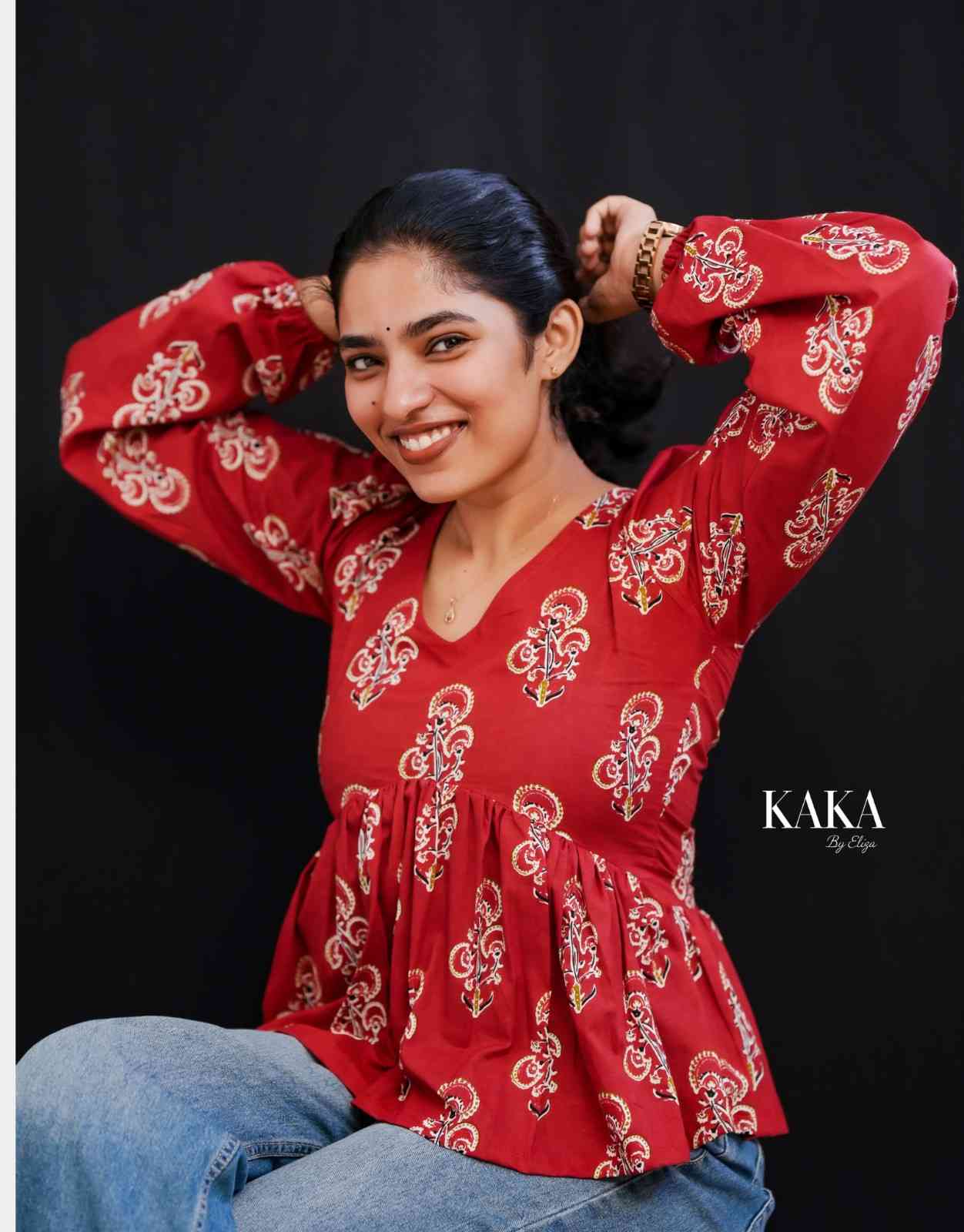 The Peplum Top brings vibrant charm to your casual collection. Featuring an elegant red base adorned with intricate floral motifs, this top comes with long puffed sleeves and a flattering V-neckline. The flowy peplum hem creates a breezy silhouette, perfect for both work and relaxed outings.