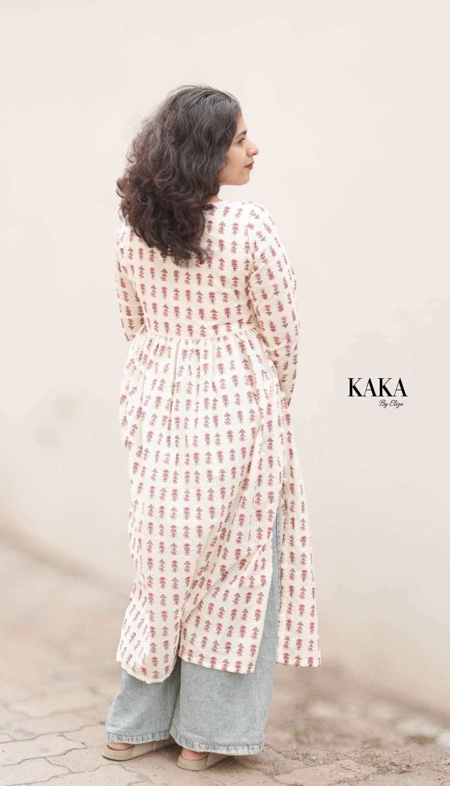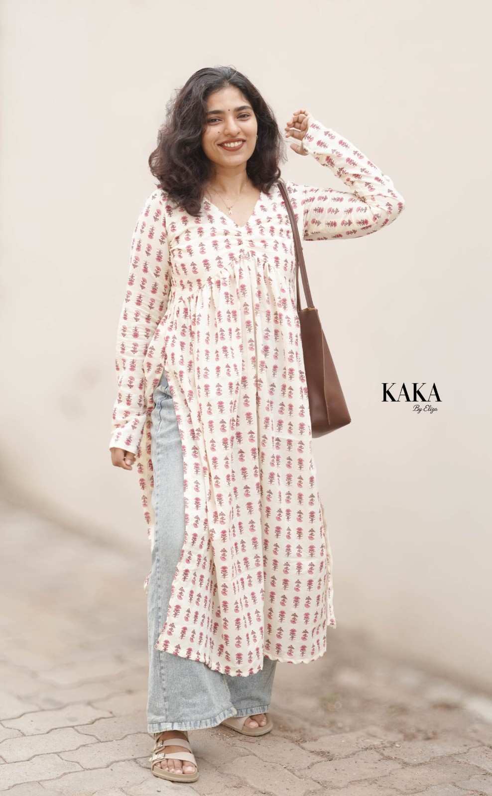 Crafted in a soothing ivory base with delicate rose motifs, this empire silhouette flatters gracefully while offering a relaxed, flowy fit. The full sleeves add elegance, making it perfect for both casual outings and subtle festive styling.