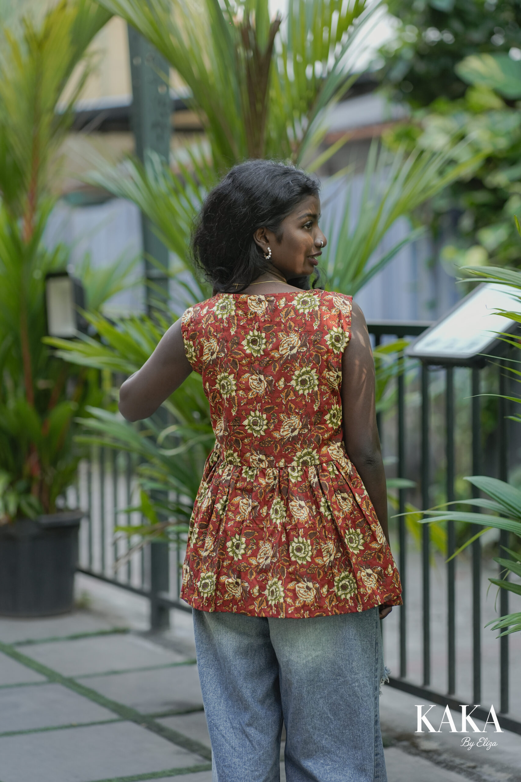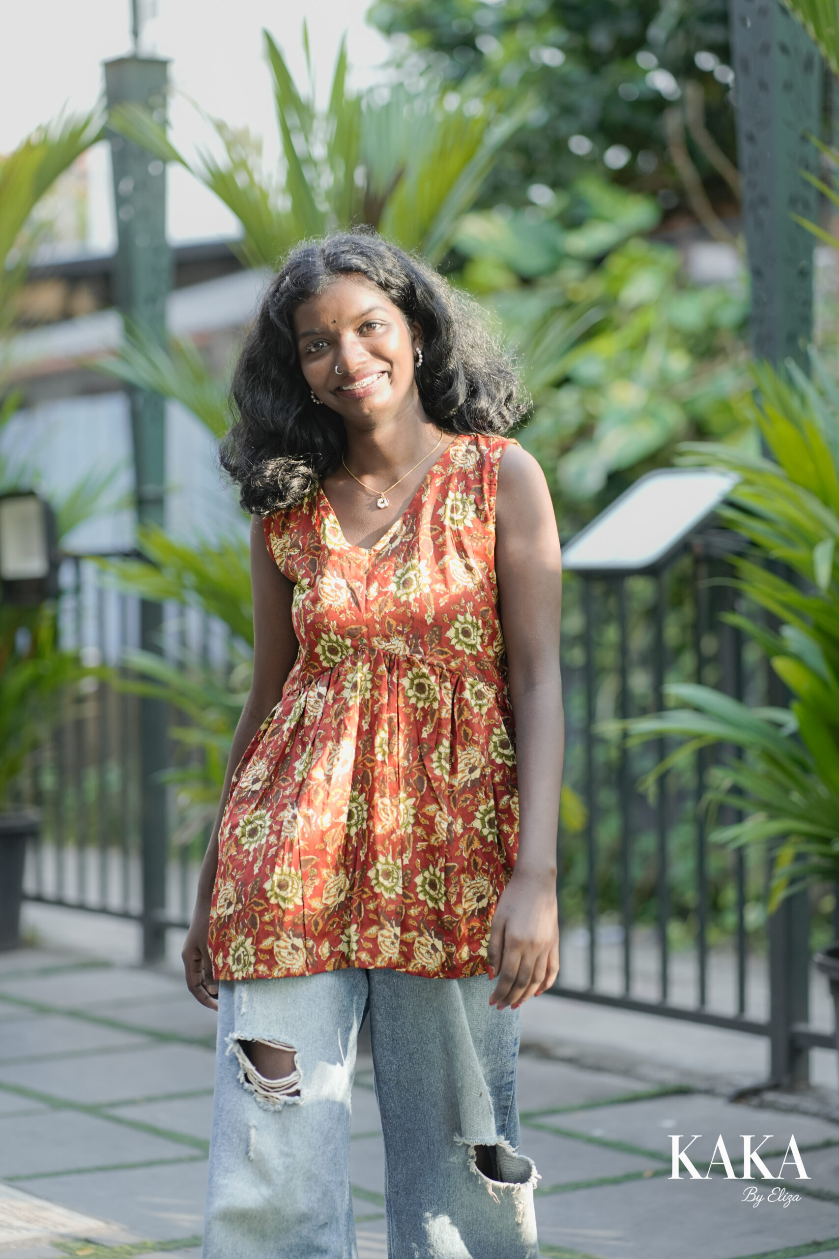 Embrace effortless style with this beautiful sleeveless top. It features a flattering V-neck and a cinched peplum-style waist for a comfortable, flowing fit. The rich, rusty floral print is perfect for pairing with denim or wide-leg trousers. Designed by KAKA to bring warmth and flair to your everyday casual or college look.