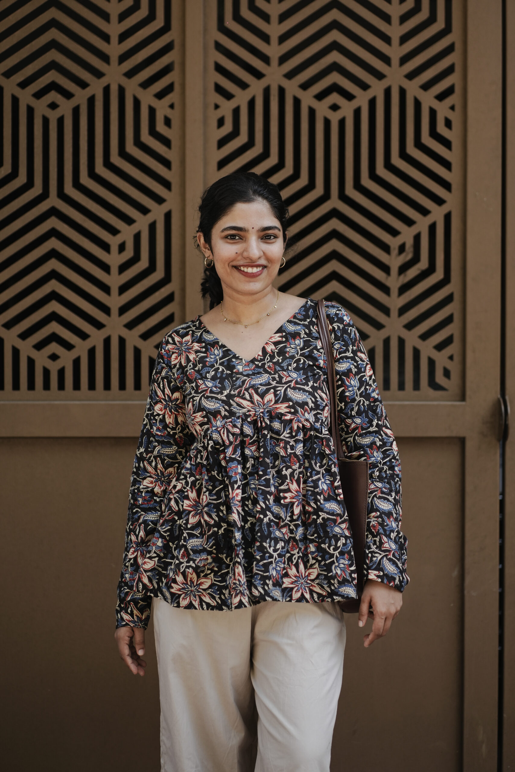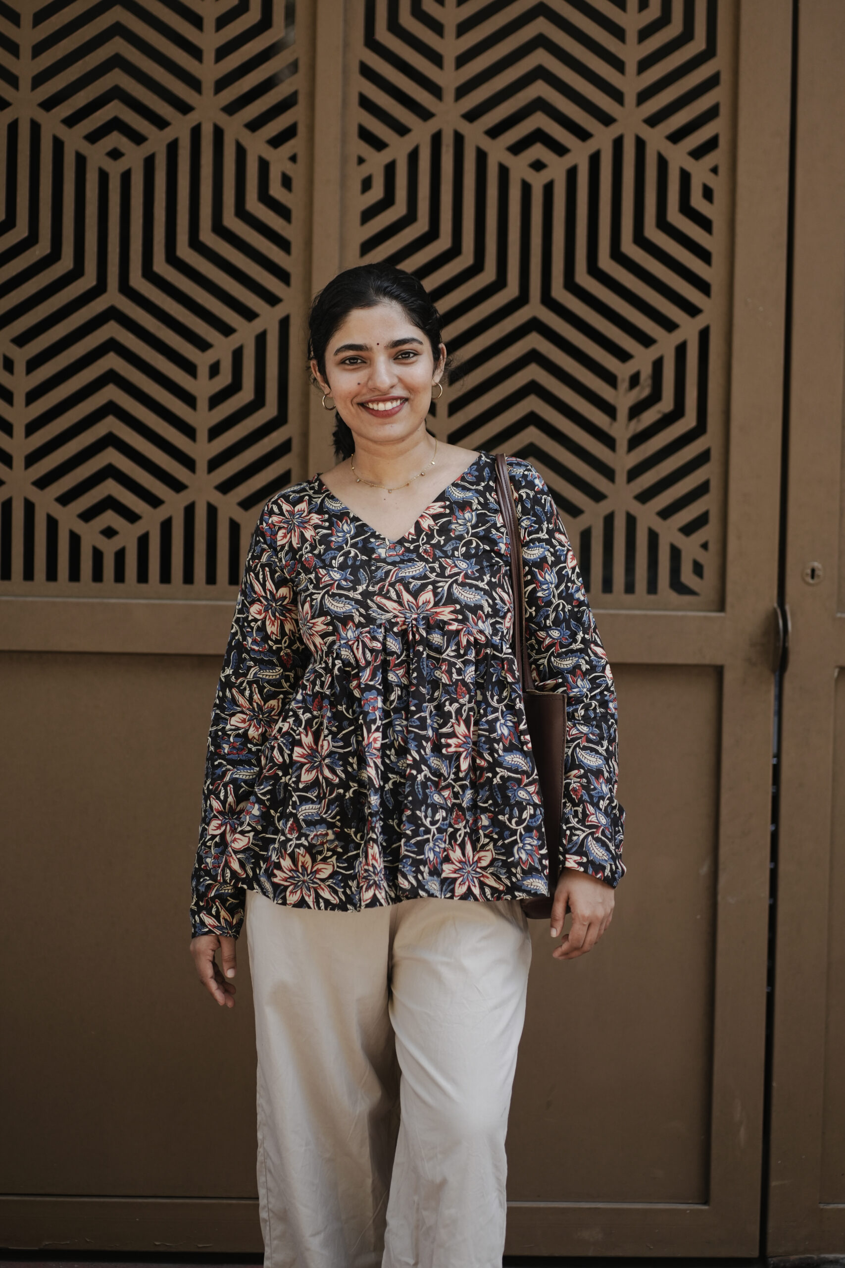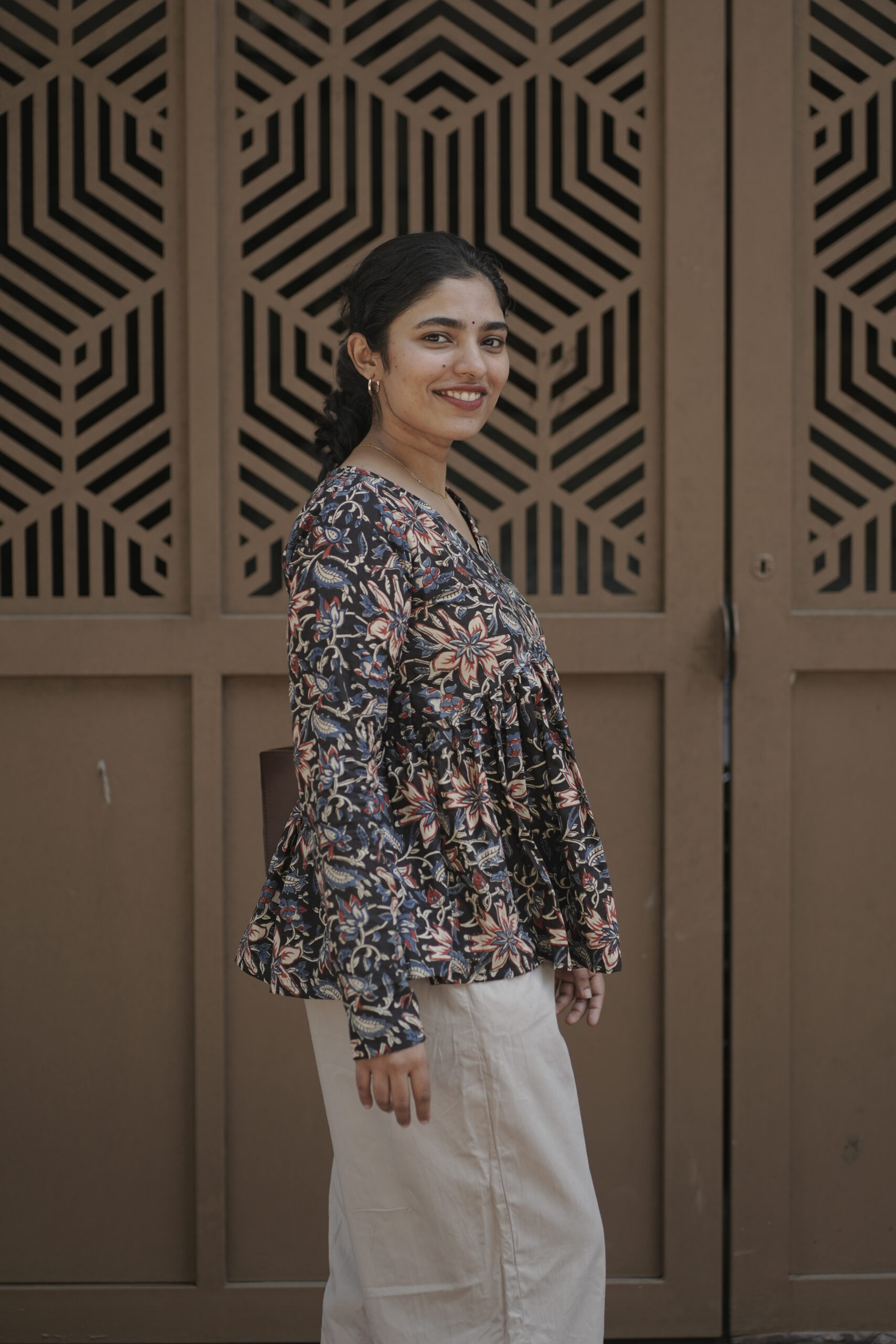 Discover the perfect blend of comfort and style with this exquisite long-sleeve peplum top. Featuring a flattering V-neckline and a rich, dark floral print, this top is designed to enhance every silhouette. Specially crafted by KAKA, its comfortable, flowy fit makes it ideal for a polished office look, a chic college day, or a casual weekend outing. An essential piece for all-season elegance.