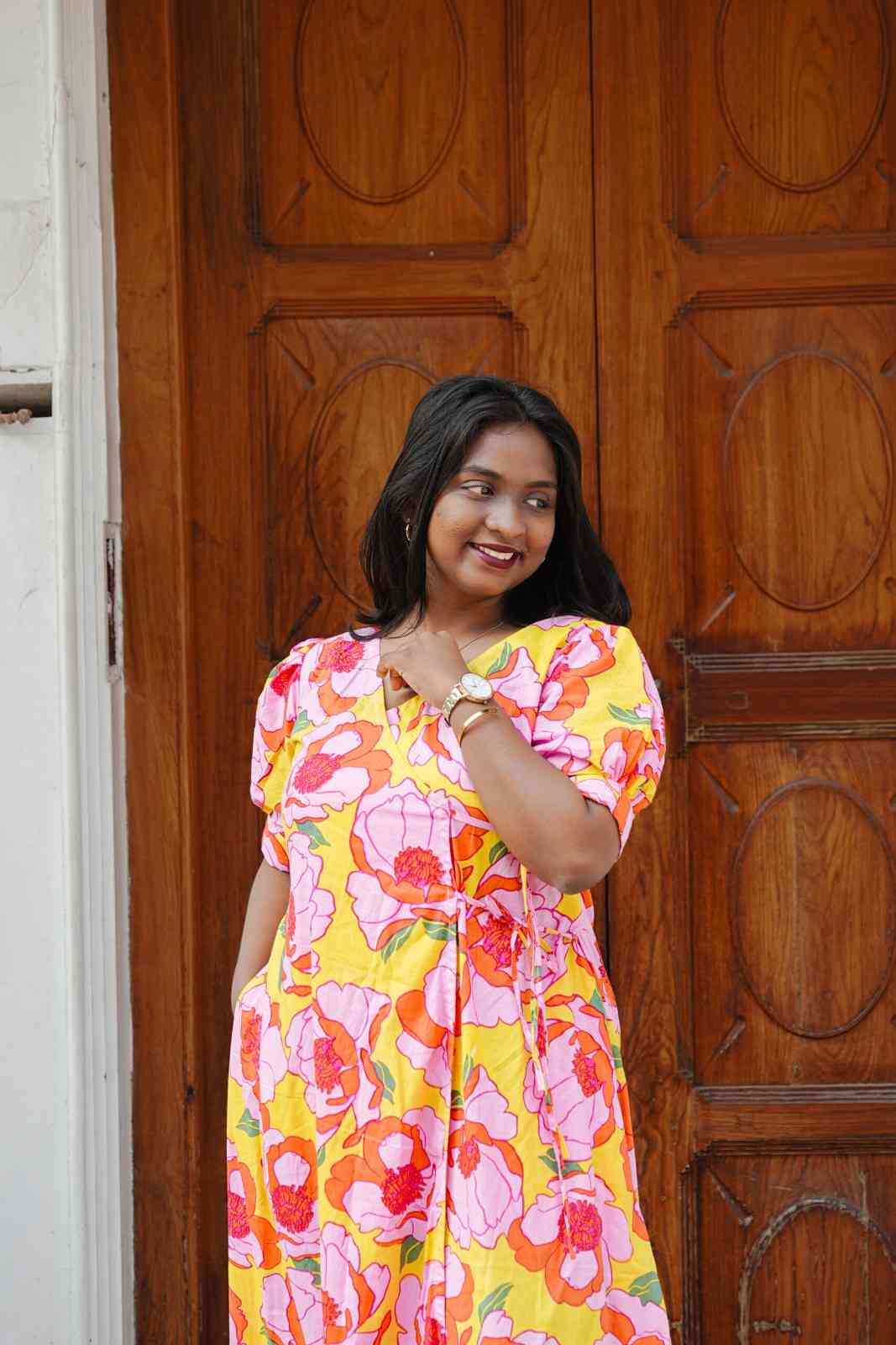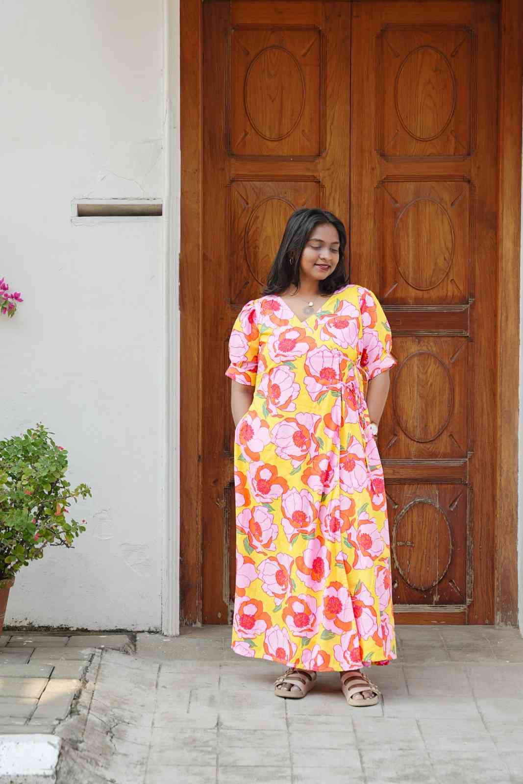 Bright, joyful, and effortlessly elegant — the Sunblush Overlap Dress is crafted from soft, breathable cotton, designed to keep you comfortable all day long. Featuring a vibrant floral print in cheerful hues, this dress brings a fresh burst of color to your everyday wardrobe.