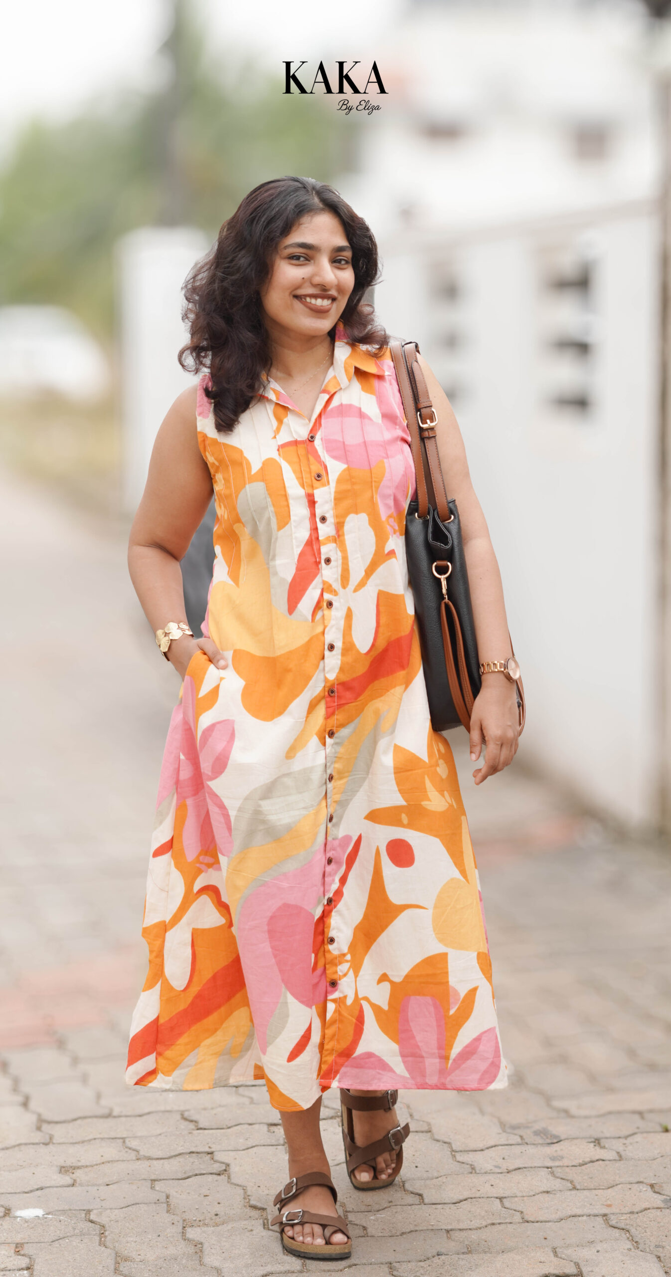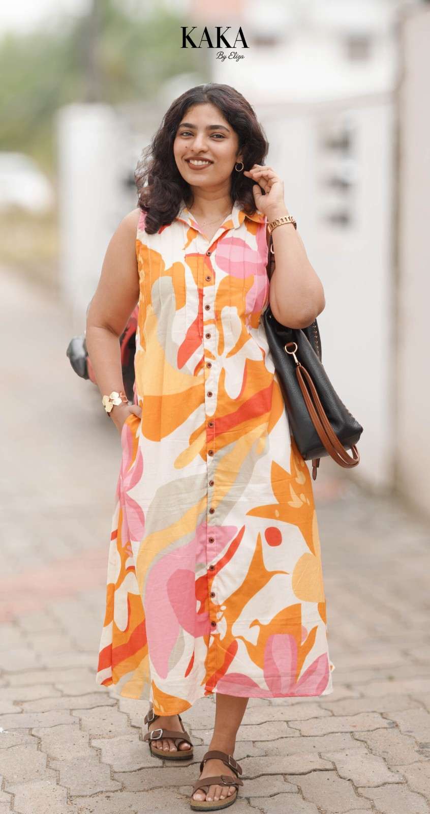 Bright, breezy, and effortlessly stylish — the Sunflora Button Shirt Dress is designed for days when comfort meets charm. Featuring a lively abstract floral print in warm yellow, peach, and soft pink tones, this sleeveless midi dress offers a relaxed silhouette that flatters every body type. Perfect for warm days, casual outings, and easy travel looks.