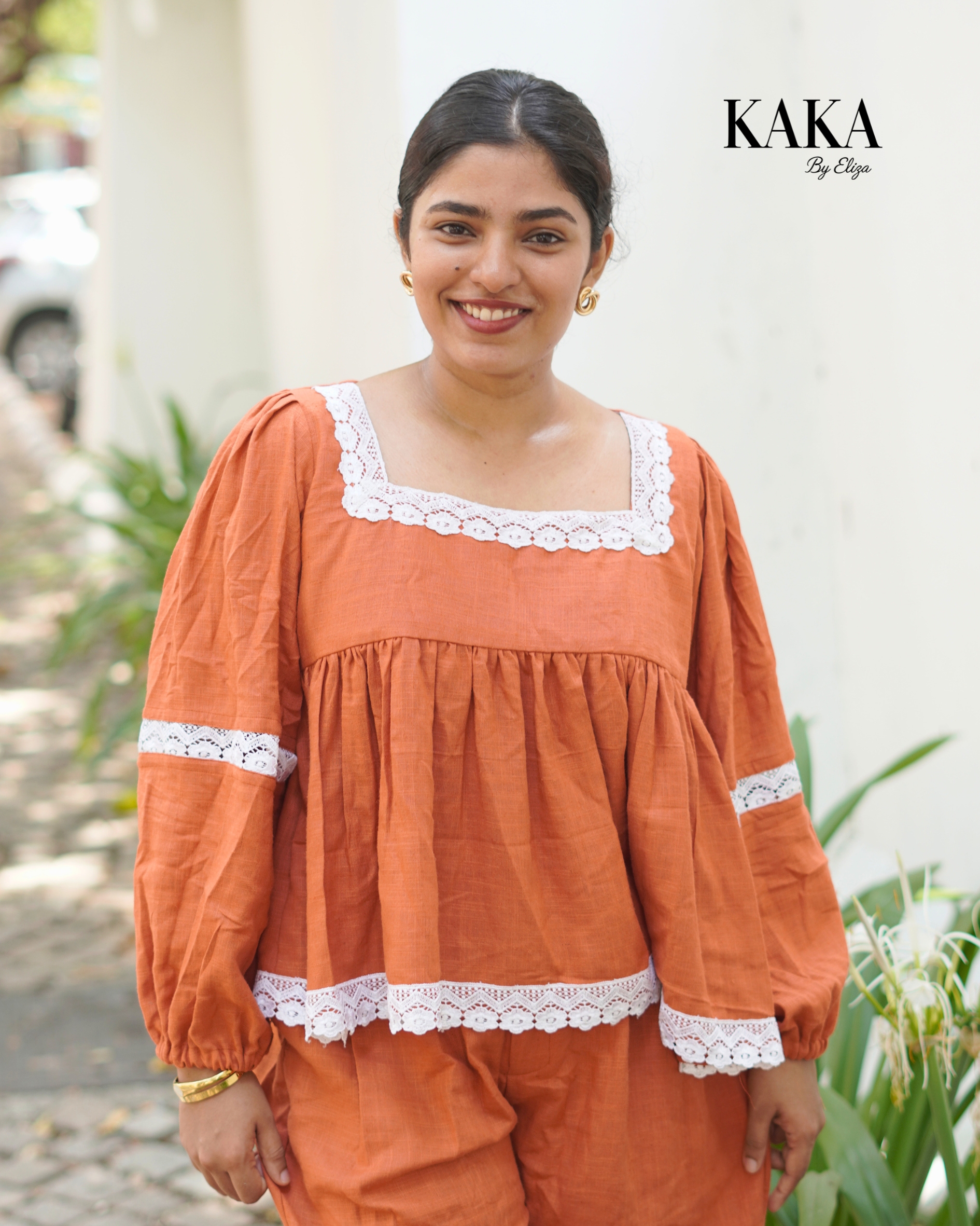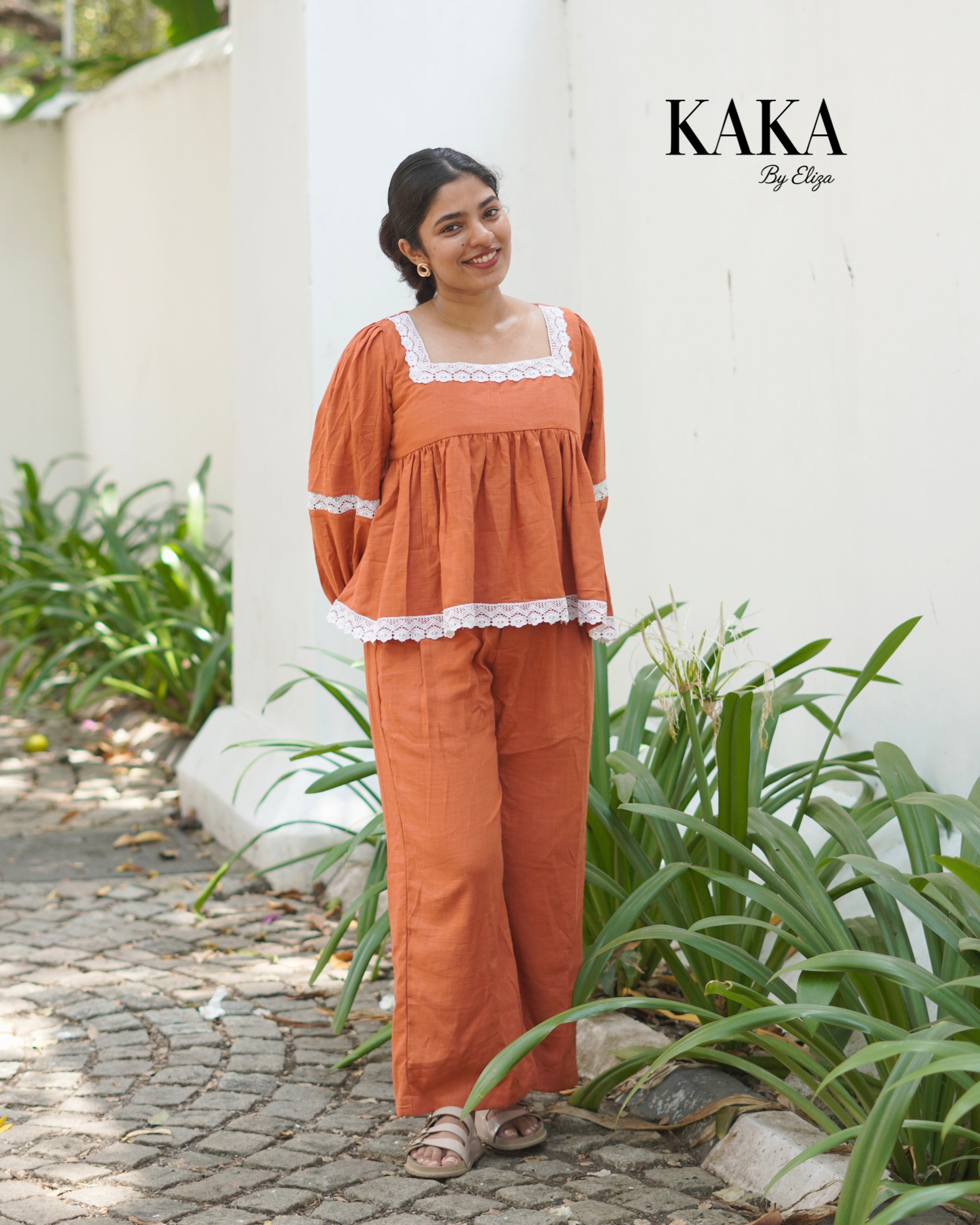 A warm terracotta co-ord set with delicate lace detailing, designed for effortless elegance. Light, breathable, and perfect for relaxed days with a touch of charm.